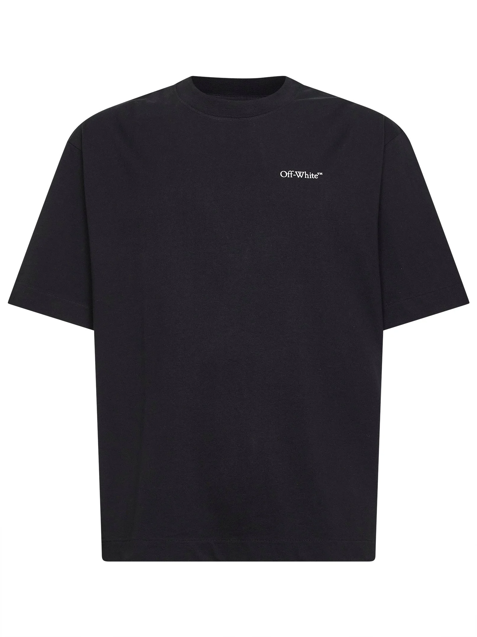 - Ribbed crewneck - Short sleeves, soft shoulders - Contrasting off-white logo at chest - Contrasting half arrow screen-printed graphic at back - Straight hem - Skate fit - Black color - 100% cotton - Made in portugal Natural (Veg): Cotton100 % Made in: Portogallo Season: P26 OMAA120S26JER008-0001