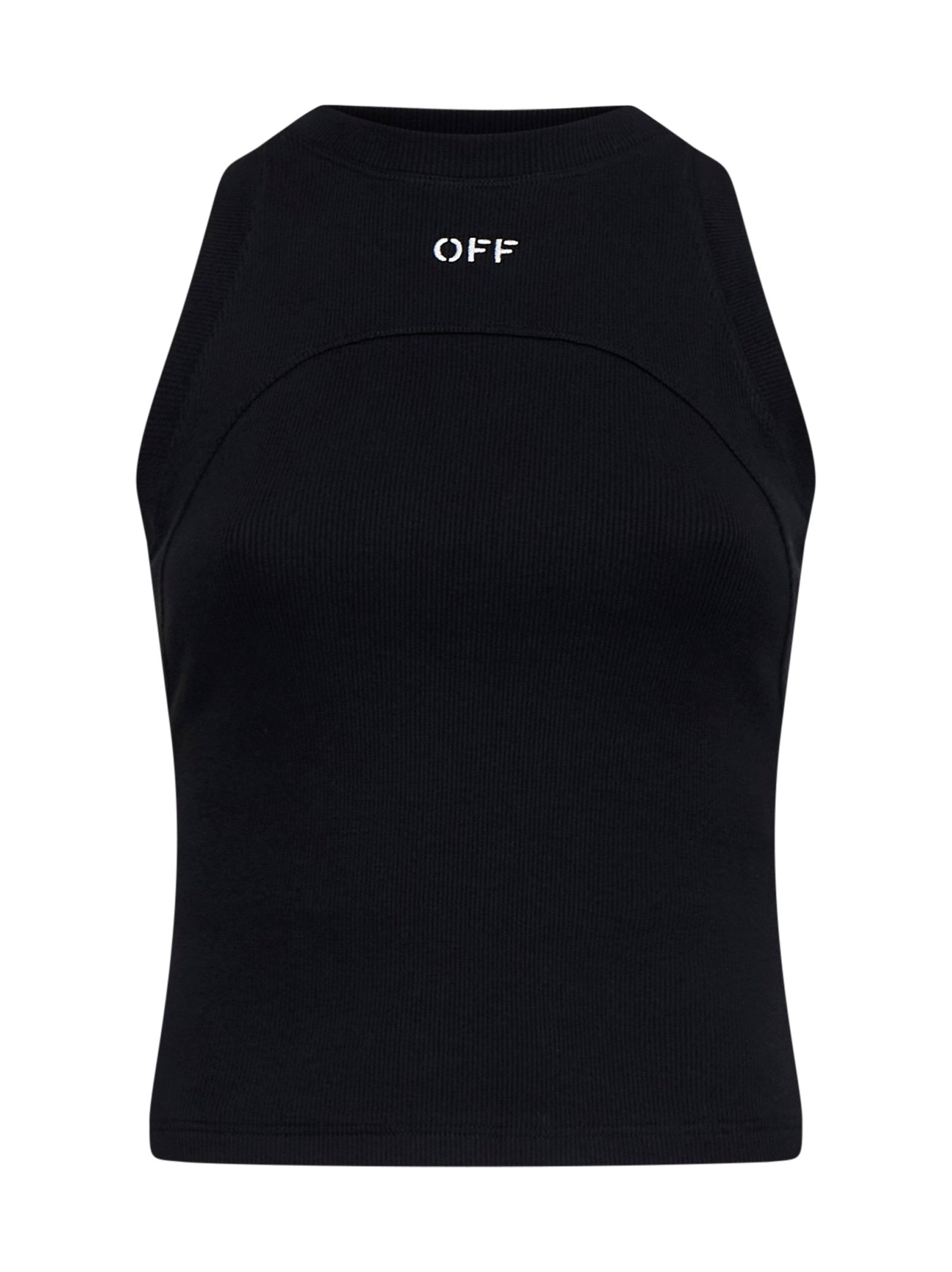 Off-White’s black ribbed knit cotton tank top featuring a crew neck, logo printed on the chest and fitted silhouette. Color: Black - white Size and fit: Model is 176 cm tall and wearing a size IT 40 Composition: 98% cotton 2% elastane Country of manifacture: Italy ID designer: OWAD236C99JER001-1001