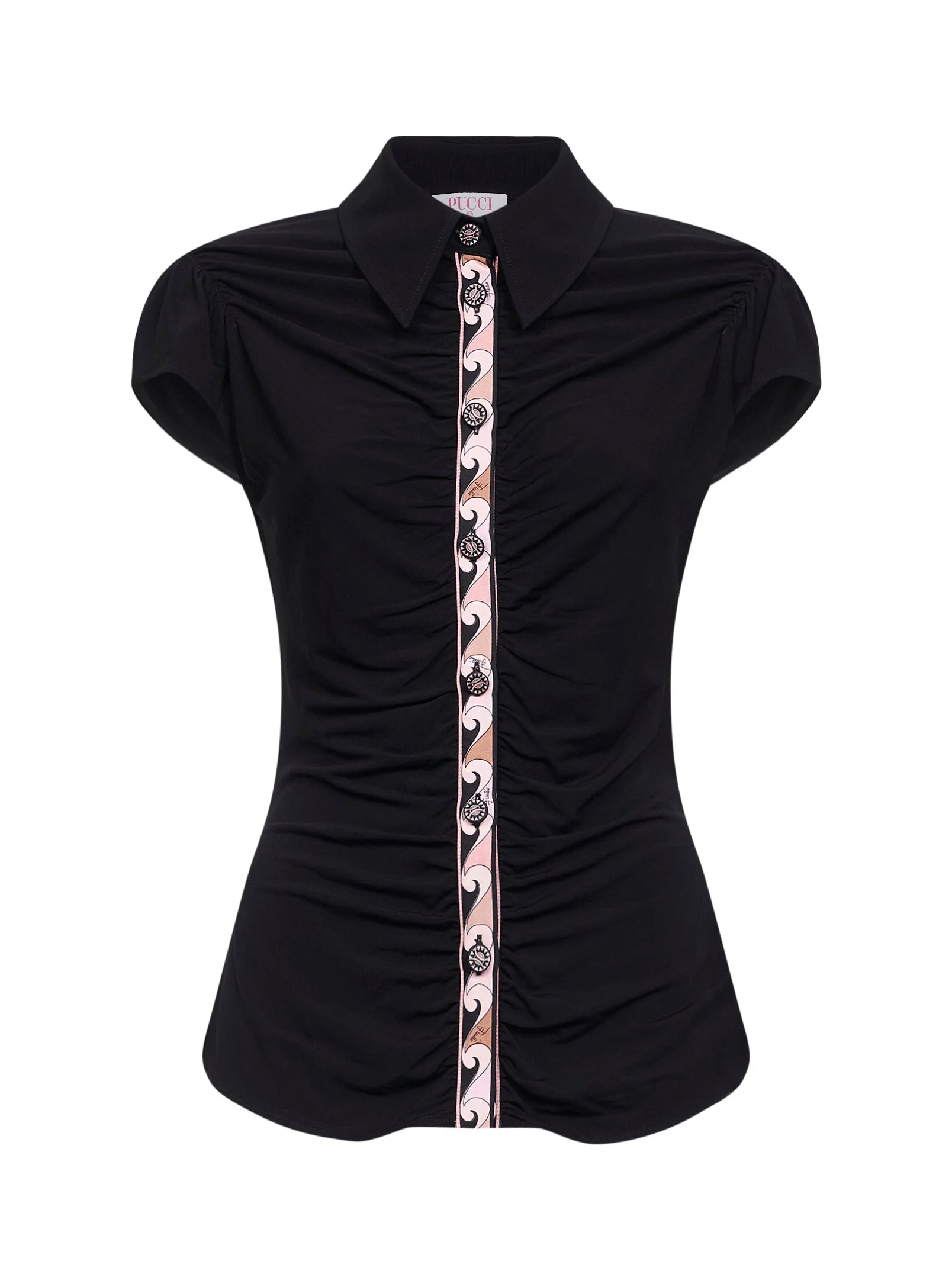 - Front printed fabric button placket, printed silk grosgrain insert along the placket; gathered and draped detailing along the placket - Pointed collar - Short cap sleeves; gathered detailing at shoulders - Slightly flared hem - Slim fit - Black color - 96% viscose, 4% elastane - Made in italy Natural (Other): Silk100 % Made in: ITALIA Season: P26 6HJJ016H621999