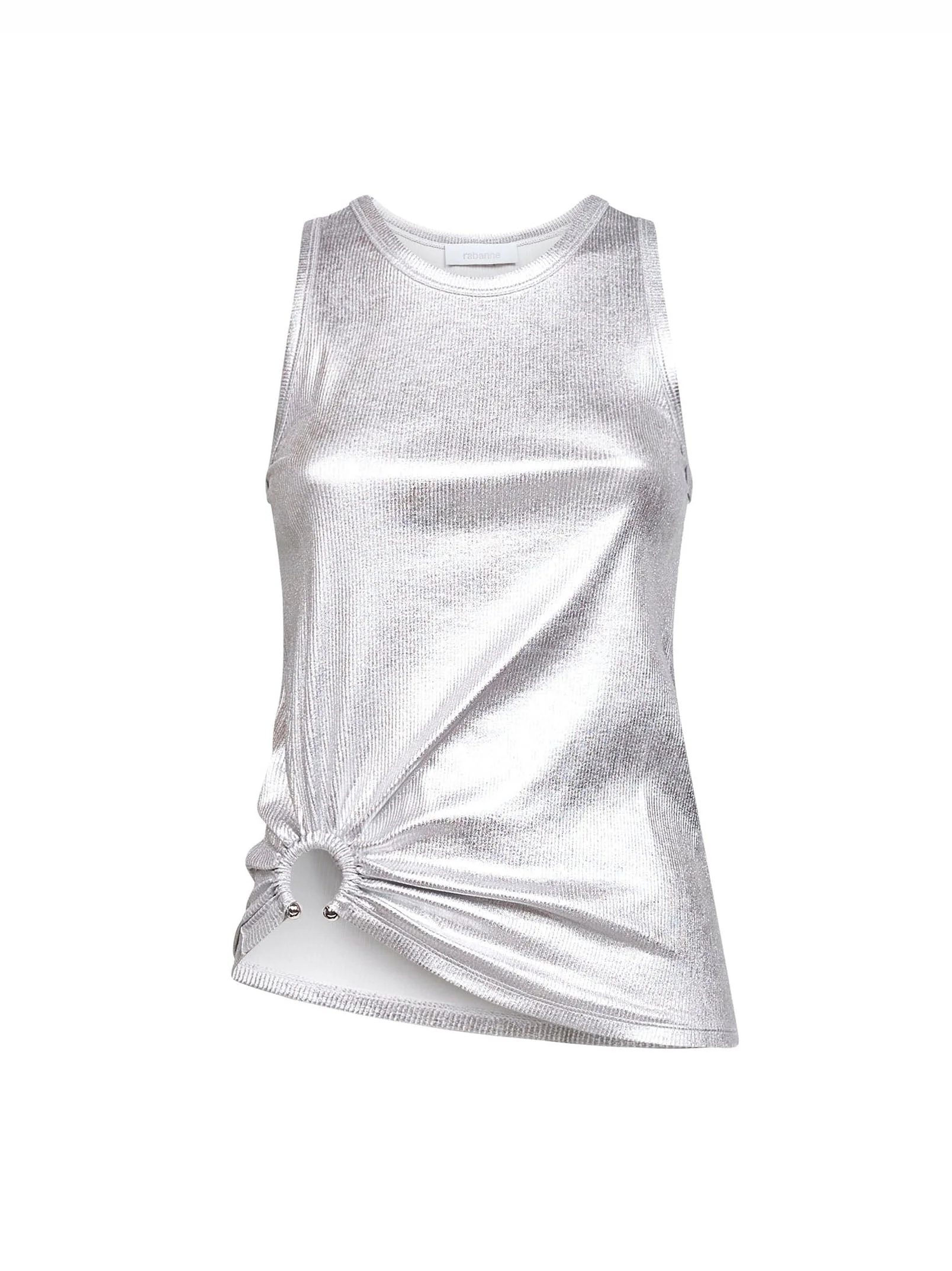 - Ribbed crewneck - Wide shoulder straps; sleeveless - Silver-toned metal logo plate at nape - Side piercing detail at hem; gathered and draped detailing at hem - Asymmetric hemline - Ribbed stretch cotton jersey design with silver foil - Silver color - 97% cotton, 3% elastane - Made in portugal Natural (Veg): Cotton97 % Synthetic: Elastane3 % Made in: Portogallo Season: P26 26PJTE031CO0530P040