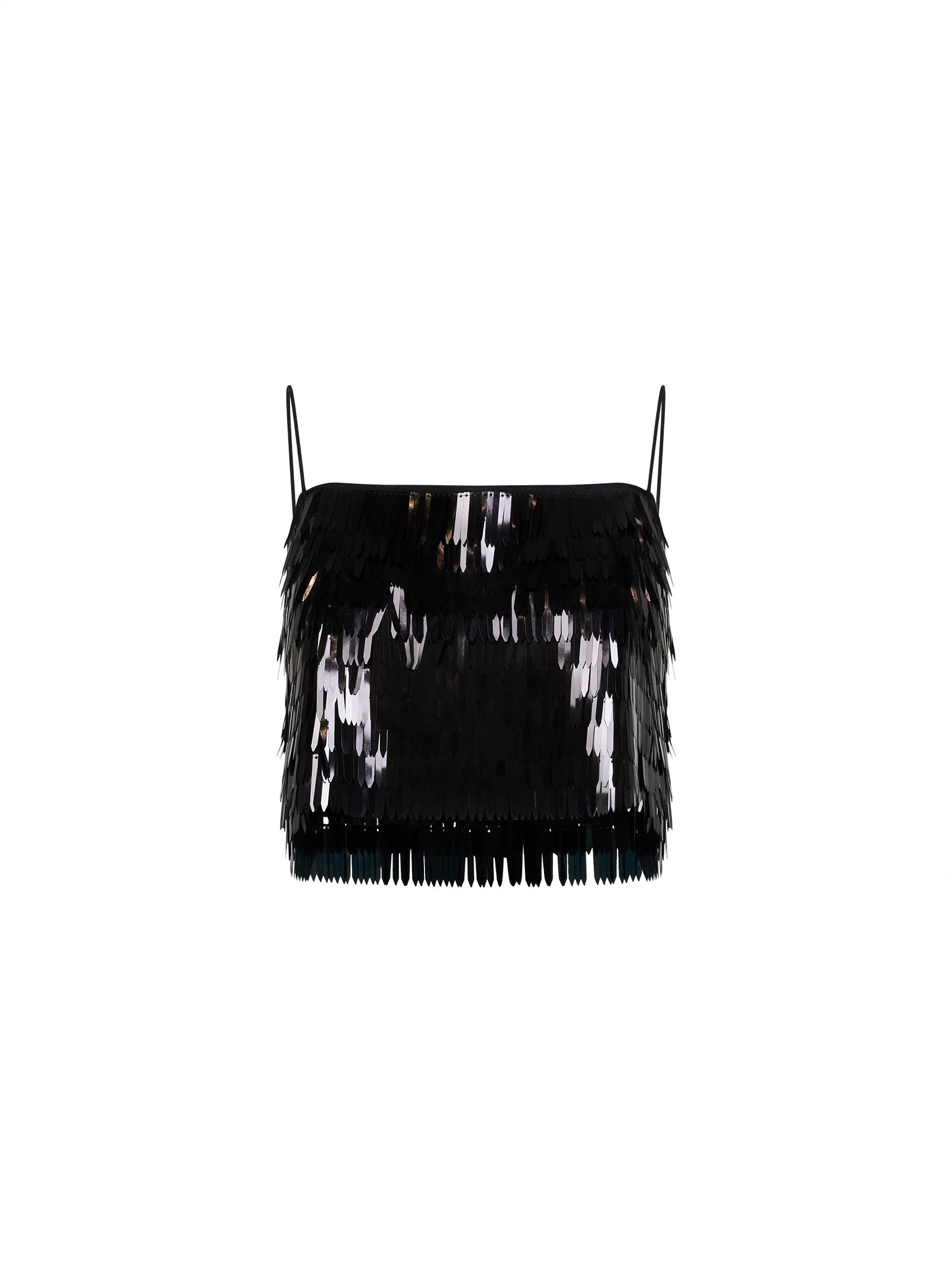 - Straight neckline with thin shoulder straps - Sleeveless - Fully lined - All-over embroidered long sequins - Cropped length - Regular fit - Black color - 100% polyester - Made in extra eu Synthetic: Polyester100 % Made in: Repubblica Popolare Cinese Season: P26 165T-BLACK