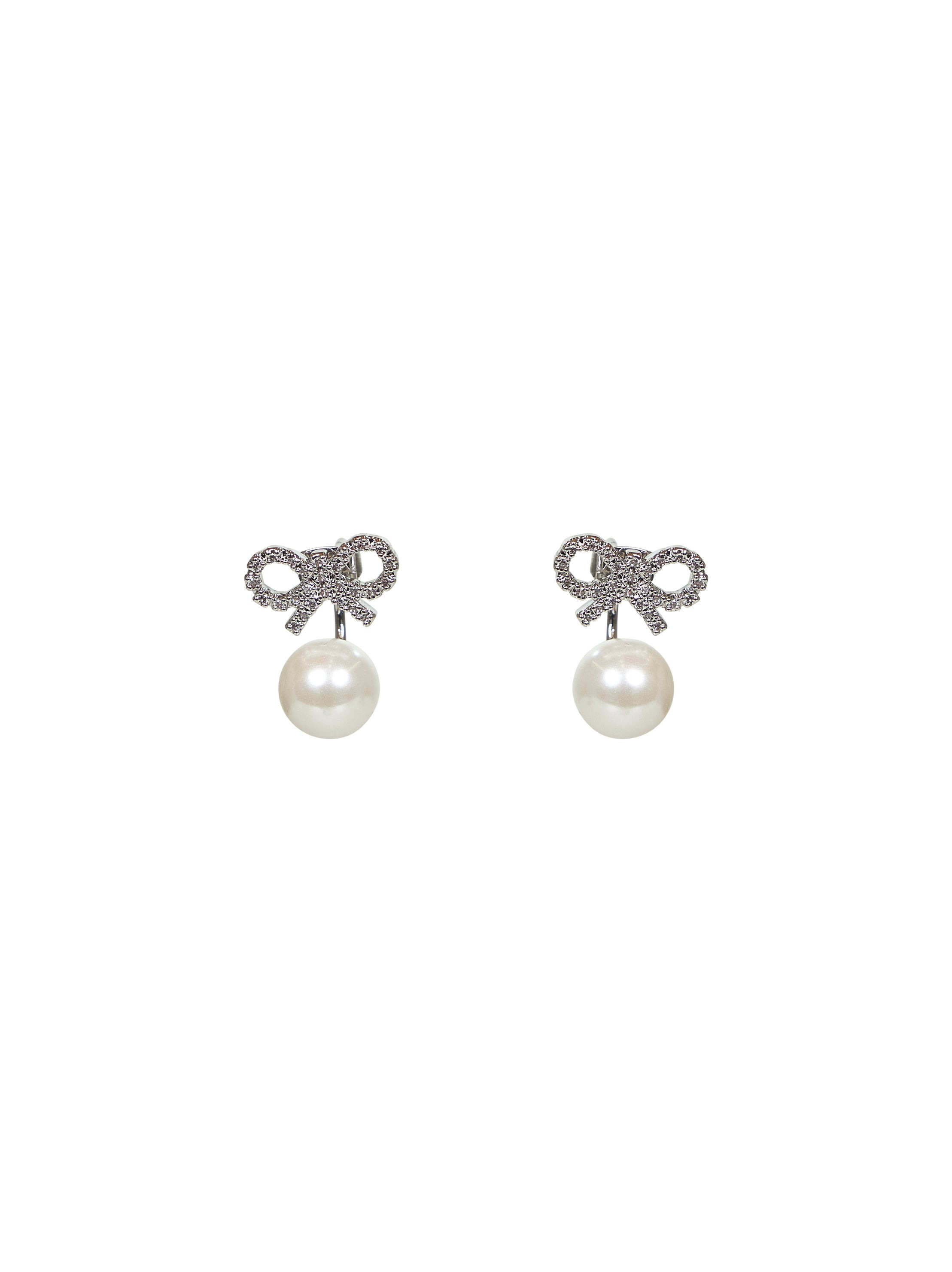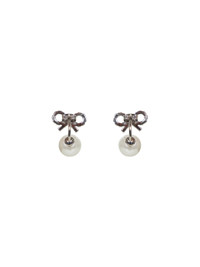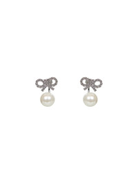- Back butterfly fastening; for pierced ears - Crystal bow - Synthetic pearl - Silver plated brass design - Length: 1.5 cm, height: 2.4 cm - Silver color - 100% brass - Made in extra eu Metals & Alloys: Brass100 % Made in: Hong Kong Season: A25 PF25624ESL-SILVER
