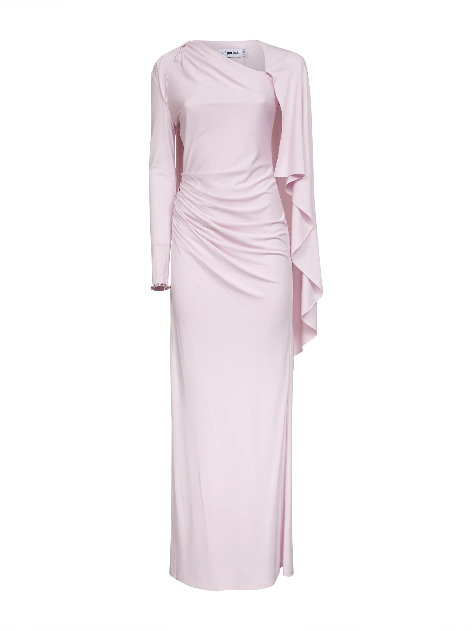 - Side invisible zip closure - Asymmetric gathered neckline - Long sleeves - Asymmetric draped cape detail - Gathered detailing at right hip; front draped detailing at waist - Slightly flared bottom: mermaid hem - Regular fit - Pink color - 95% polyester, 5% elastane - Made in extra eu Synthetic: Polyester96 % Synthetic: Spandex/Elastane4 % Made in: Repubblica Popolare Cinese Season: P26 505X-PINK