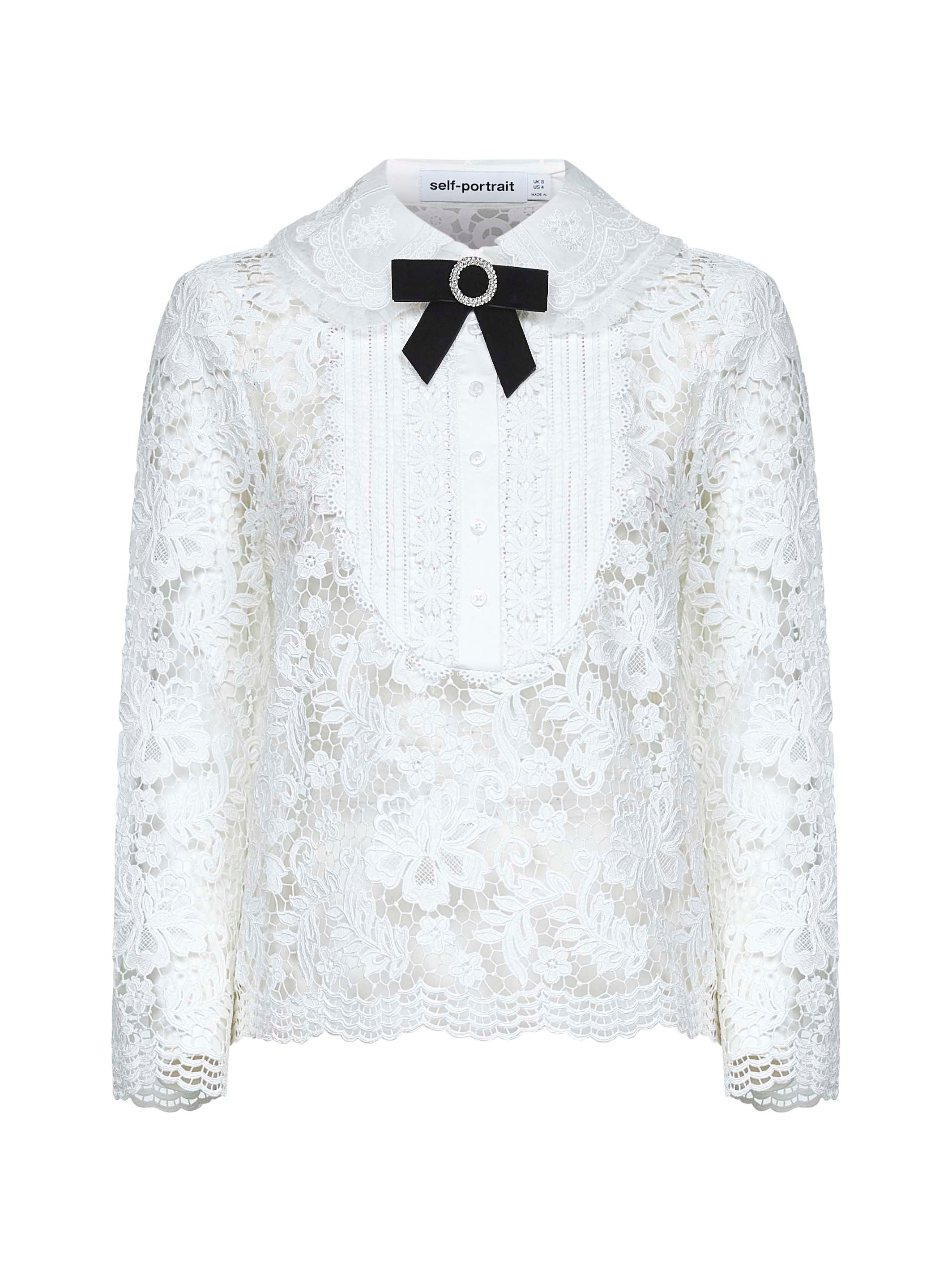 - Front partial button placket; contrasting velvet bow brooch with crystal ring - Embroidered organza layered-effect double collar - Wrist-length sleeves - Pleated cotton bib with scalloped edge and 3d daisy detailing - Scalloped cuffs and hem - Unlined - Relaxed fit - White color - 100% polyester - Made in extra eu Synthetic: Polyester100 % Made in: Repubblica Popolare Cinese Season: A25 AW25061TBW-WHITE