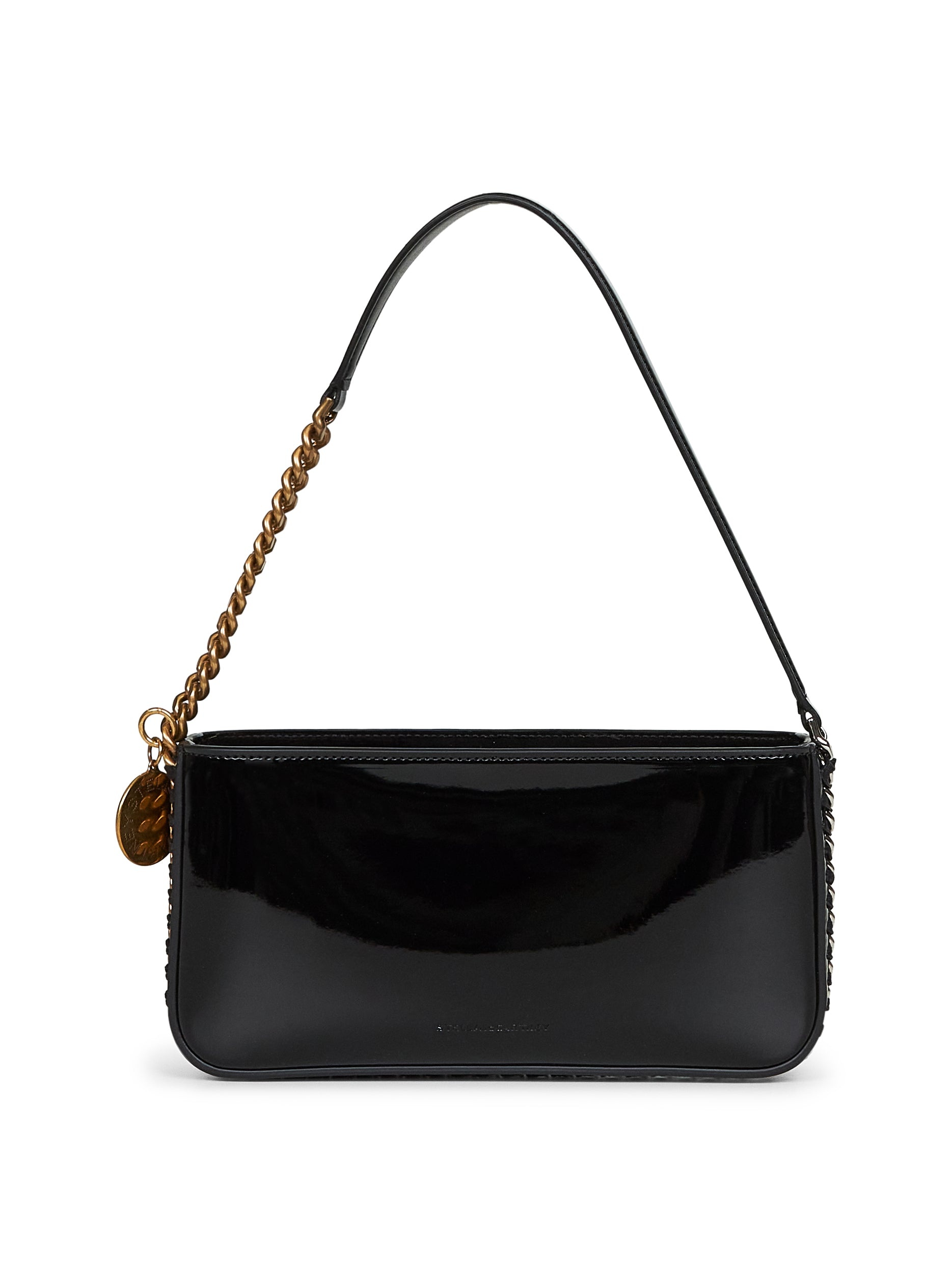 - Top zip fastening - Diamond-cut chain and patent eco-leather shoulder strap - Logo medallion - Interior: one main compartment; monogram recycled polyester lining - Metal diamond-cut chain detail at sides and bottom - Ruthenium-toned recycled brass and aluminum hardware - Patent vegan leather alternative design - 24 x 14.5 x 1 cm; shoulder strap drop: 20.5 cm - Black color - 100% polyamide - Made in italy Synthetic: Polyamide100 % Made in: ITALIA Season: P25 7B0116WP05191000