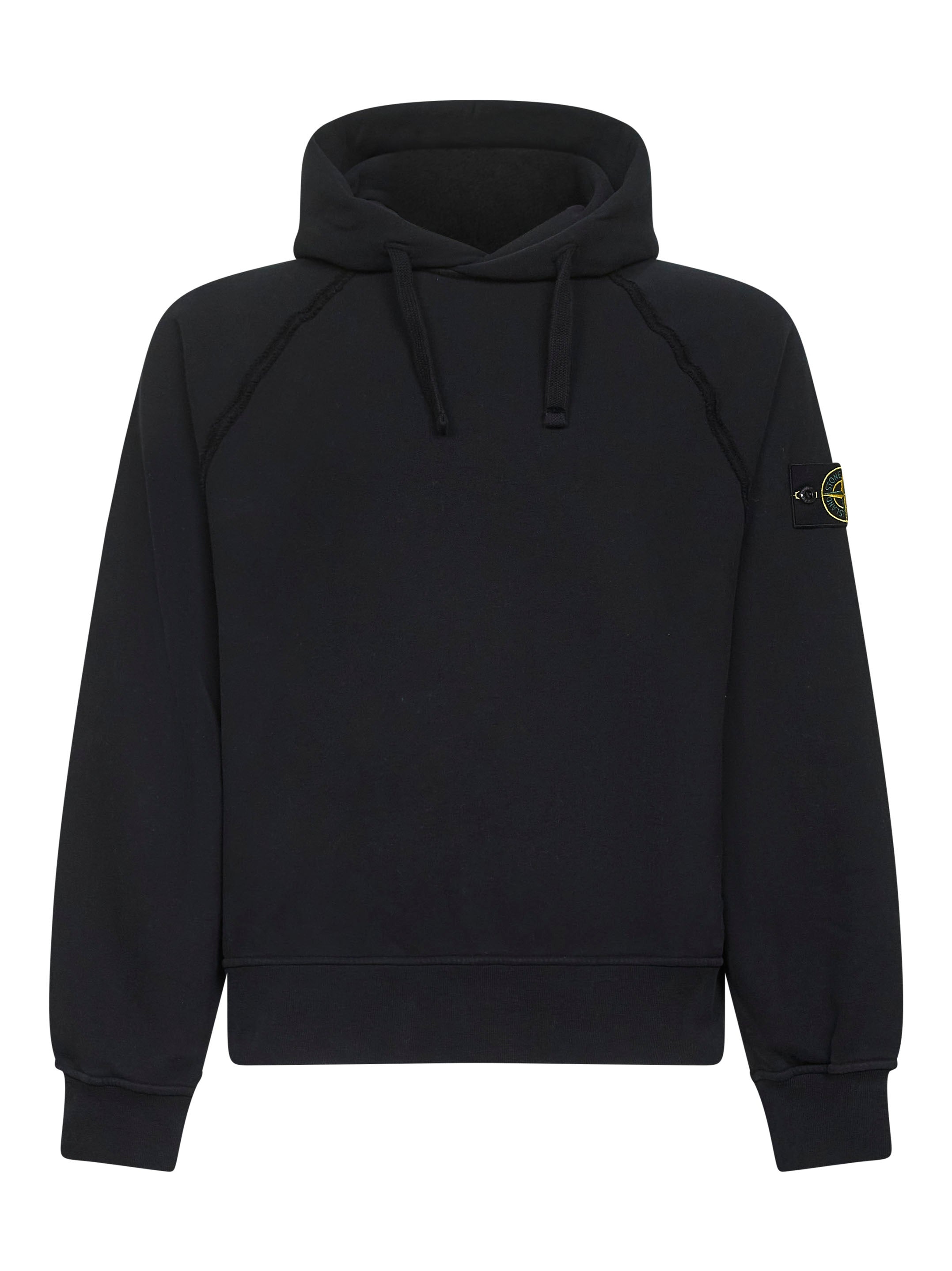 - Hood with adjustable drawstring - Oversized raglan sleeves with overlock stitching and frayed trims; stone island badge at left sleeve - Elasticated ribbed cuffs and bottom band - Garment dyed - Oversized fit - Black color - 100% cotton - Made in romania Natural (Veg): Cotton100 % Made in: Romania Season: A25 K2S156100023S0A20V0029