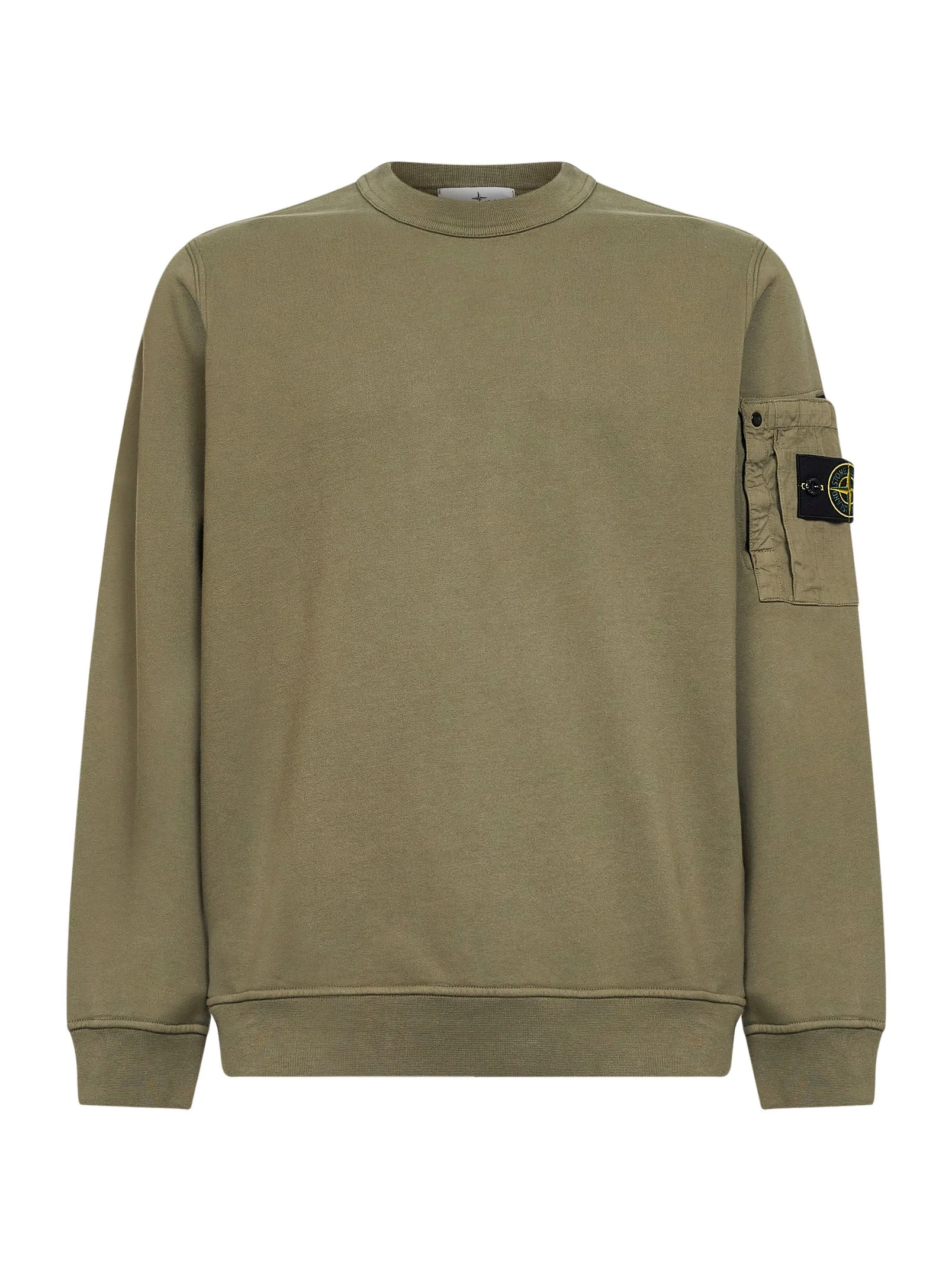 - Ribbed crewneck - Long sleeves; ripstop cotton patch pocket at left sleeve with hook-and-loop fastening along top and side, snap button and loop at corner, pleat detail, and stone island badge - Elasticated ribbed cuffs and bottom band - Midweight cotton design; garment-dyed model - Regular fit - Military green color - 100% cotton - Made in extra eu Natural (Veg): Cotton100 % Made in: Tunisia Season: P26 L1S156100019S0410V005G