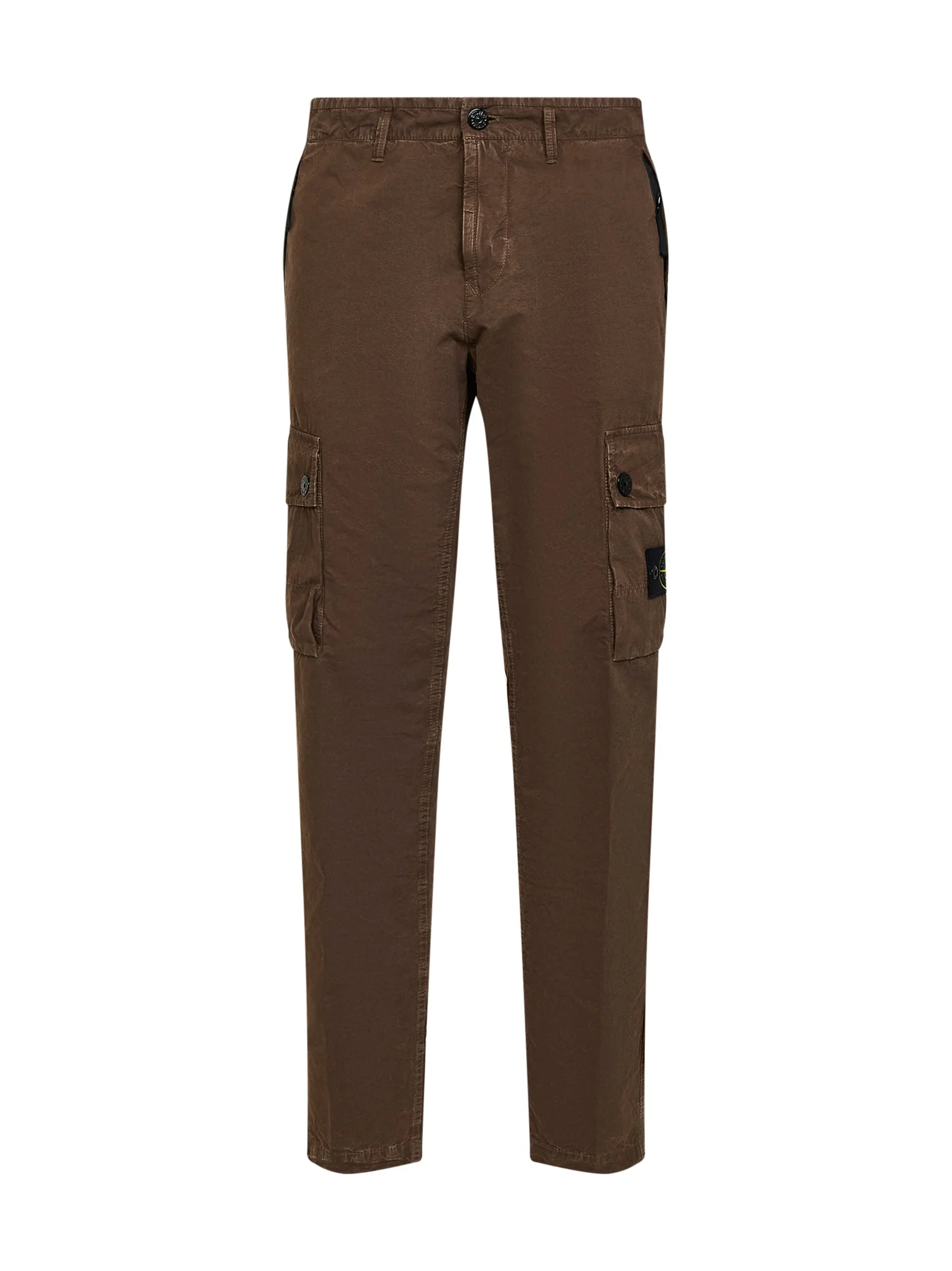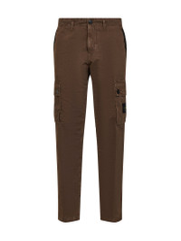 - Front zip-fly closure, metal logo button - Waist with belt loops - Side standing pockets with hidden zip closure, back slit pocket with hidden snap button closure, bellows patch pockets at legs with snap-buttoned flap; stone island badge at left pocket - Garment dyed model with "old" treatment - Slim fit - Shadow brown color - 100% cotton - Made in romania Natural (Veg): Cotton100 % Made in: Romania Season: P26 L1S153100053S00WAV017C