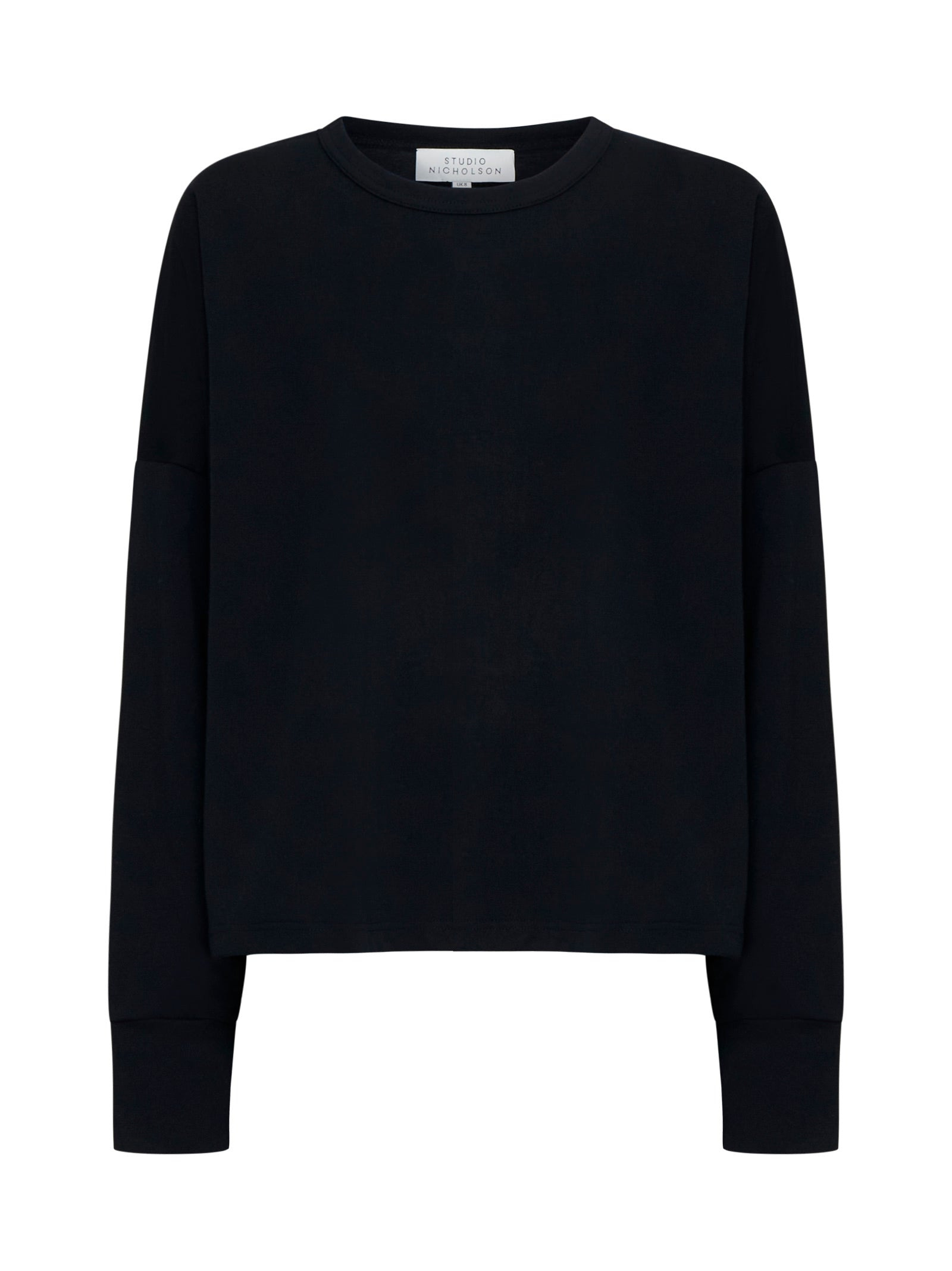- Black color - 100% cotton - Lightweight jersey - Crew neck - Dropped shoulder sleeves - Long sleeves - Ribbed hems - Logo print on the back - Straight hem - Made in eu Natural (Veg): Cotton100 % Made in: Portogallo Season: A25 LOOPSNWMRCRIZEDCOTTONLOGOBLACK