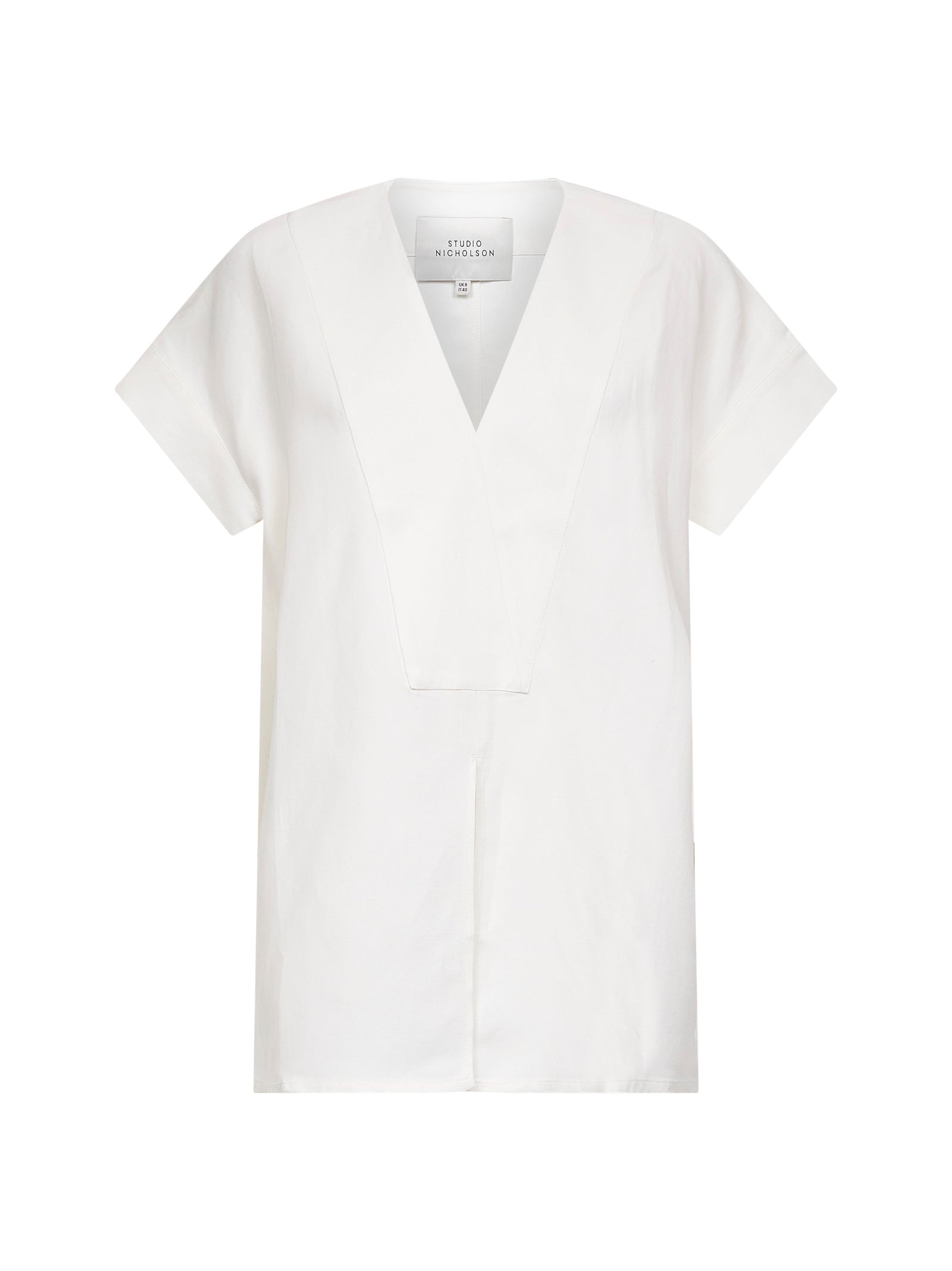 - V-neck; wide v-neck panel at front - Short kimono sleeves, mock cuffs - Centre slit at bottom front - Loose, relaxed fit - White color - 73% viscose, 27% linen - Made in portugal Synthetic: viscose73 % Natural (Veg): Linen/Flax27 % Made in: Portugal Season: P25 CIRCESNW1608-PARCHMENT