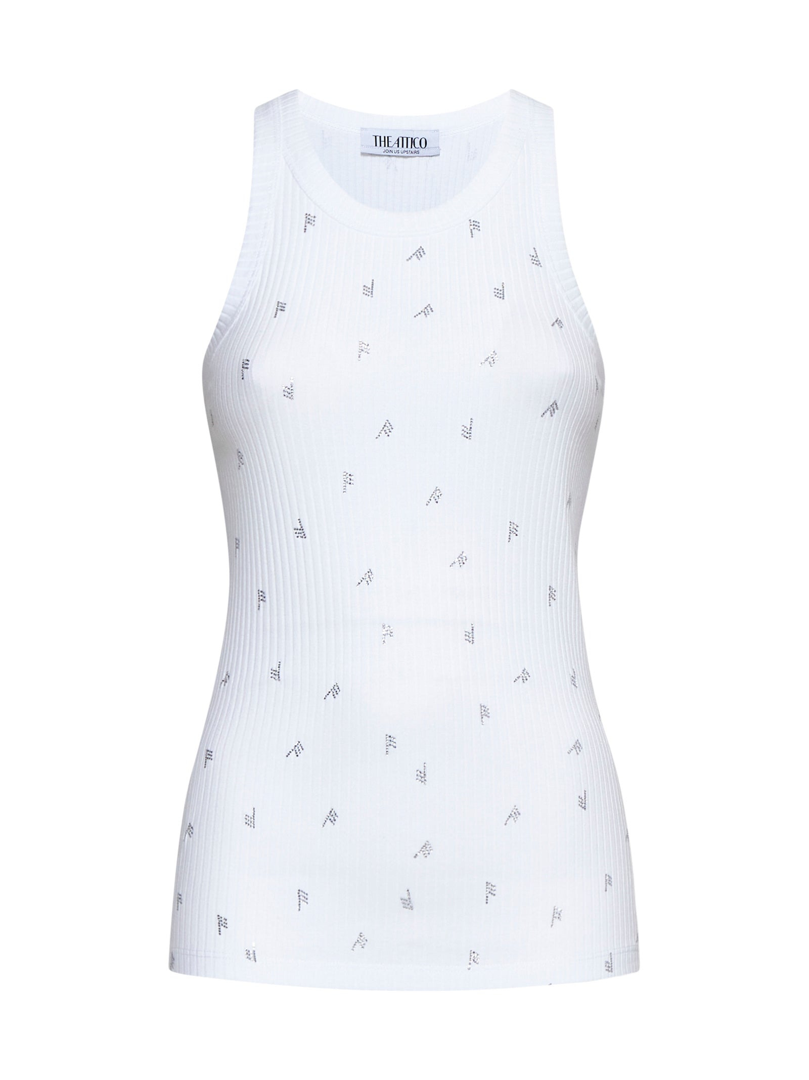 •Ribbed crewneck, racer neckline •All-over crystal-colored logo hotfix •Regular fit •White color •100% Cotton •Made in Portugal Size and fit: Model is 173 cm tall and wears size IT 40 Country of manifacture: Portogallo ID designer: 247WCT276J051L480