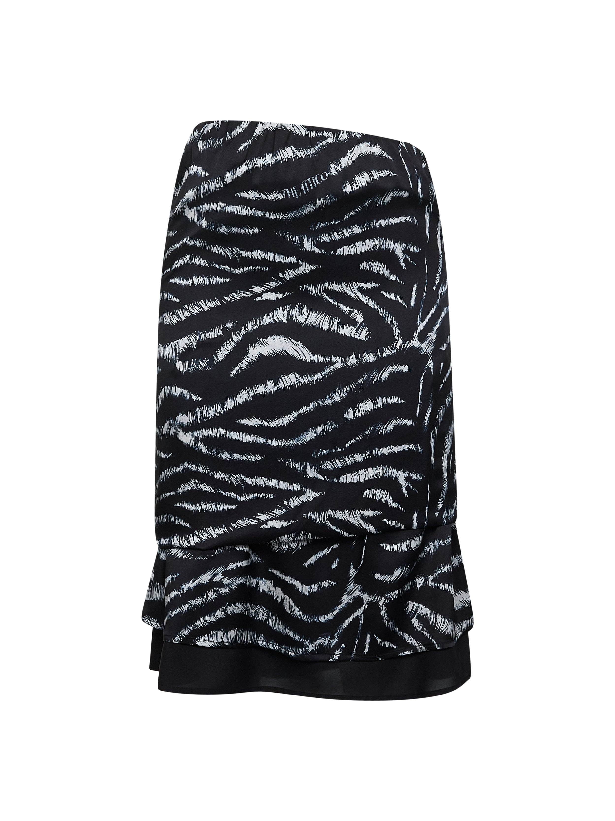 - Elasticated waistband - Solid color insert at bottom - Draped top - Zebra print - Knee length - Regular fit - Color: white/black - 52% viscose, 38% silk, 10% elastane - Made in italy Synthetic: viscose52 % Natural (Other): Silk38 % Synthetic: Elastane10 % Made in: ITALIA Season: P25 250WCS00253VSE001PR414