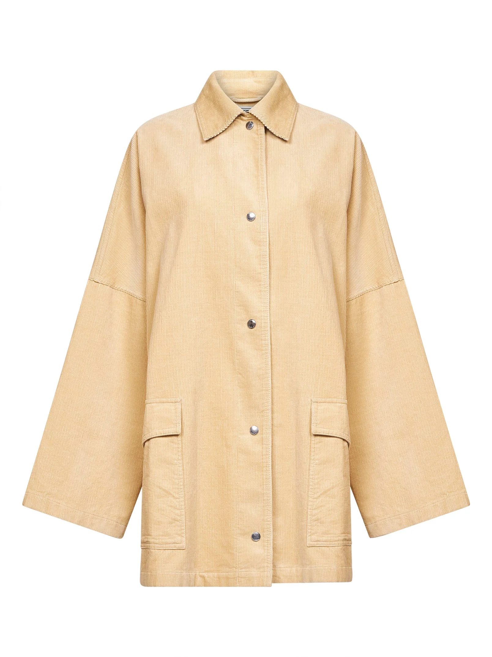 - Front snap button placket - Shirt collar - Long wide sleeves, dropped shoulders - Side patch pockets with flap - Unlined - Oversized fit - Beige color - 100% cotton - Made in lithuania Natural (Veg): Cotton100 % Made in: Lithuania Season: P26 261WRO0269FB0554-072