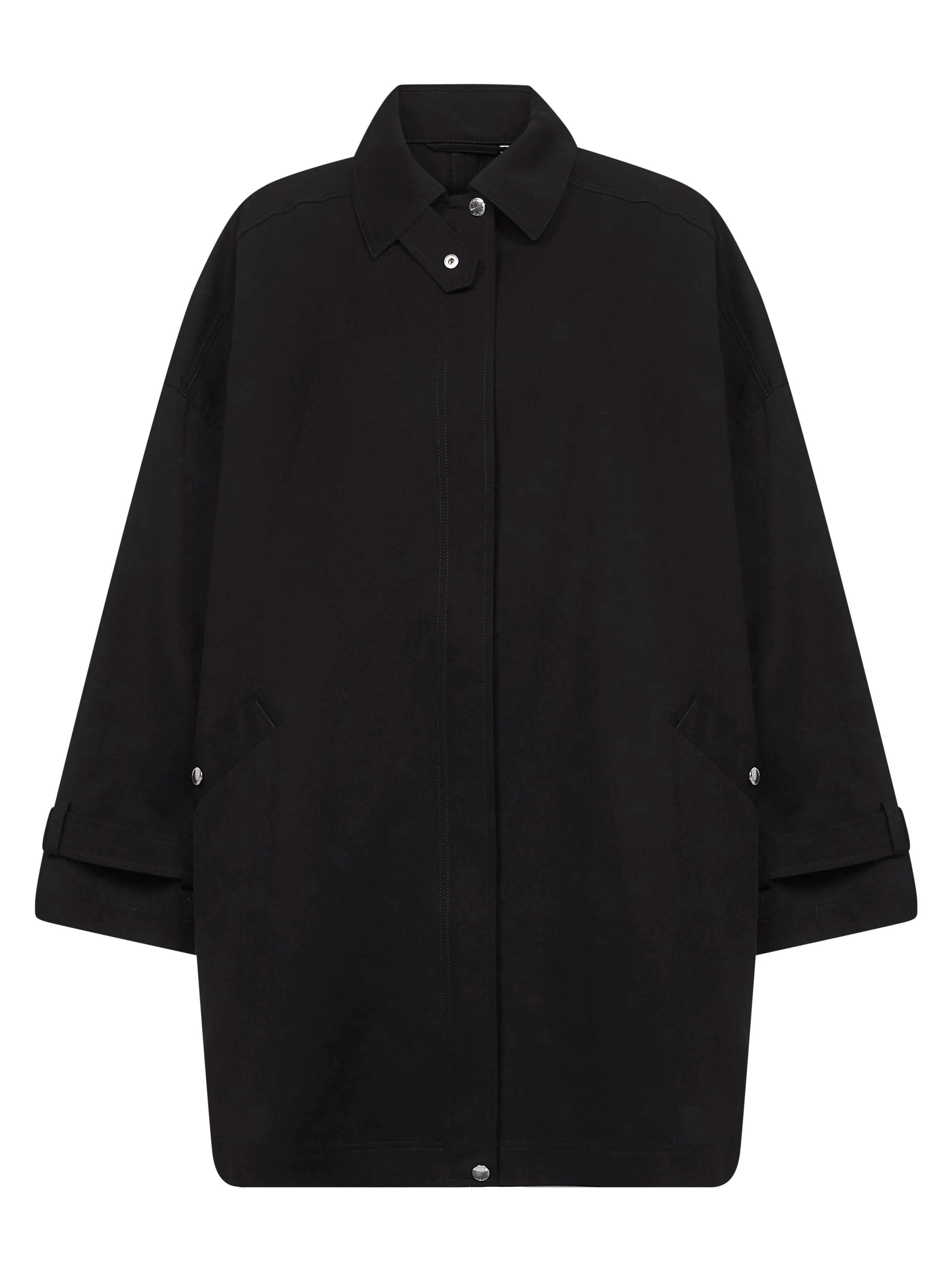 - Front covered zip and snap button placket - Pointed collar, snap-buttoned chin strap - Long sleeves, dropped shoulders, attached adjustable cuff belts - Slanted snap-buttoned side welt pockets - Unlined - A-line silhouette - Oversized fit - Black color - 100% organic cotton - Made in lithuania Natural (Veg): Organic Cotton100 % Made in: Lithuania Season: A25 253WRO0220FB0490-001