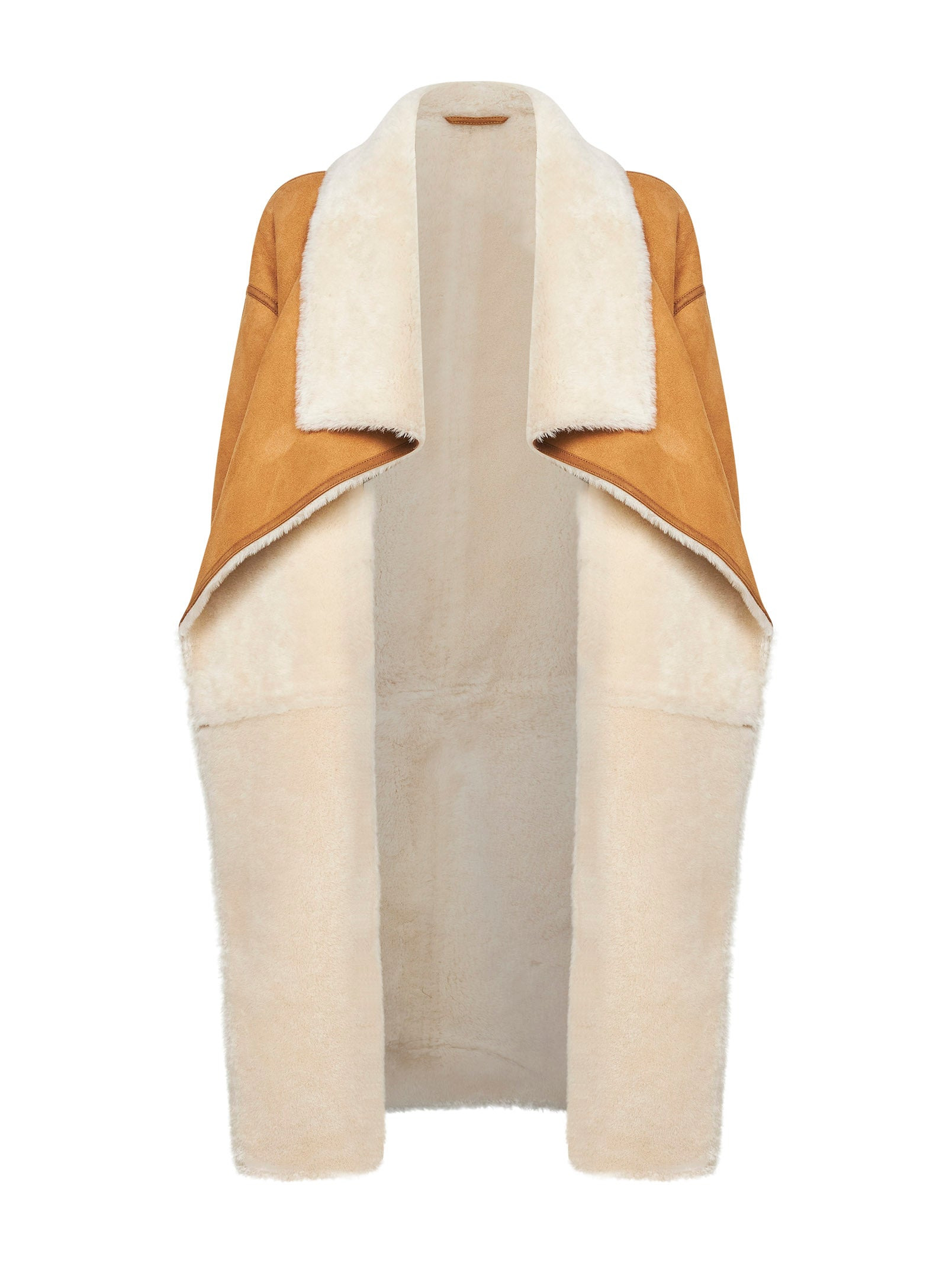 - Draped open front - Oversized shearling collar - Long sleeves, dropped shoulders - Waist slip pockets - Shearling lining - Paneled suede design - Slouchy fit - Camel color - 100% lambskin - Made in extra eu Furs & Skins: Lamb Skin100 % Made in: Turchia Season: A25 254WRO0260LE0169-105