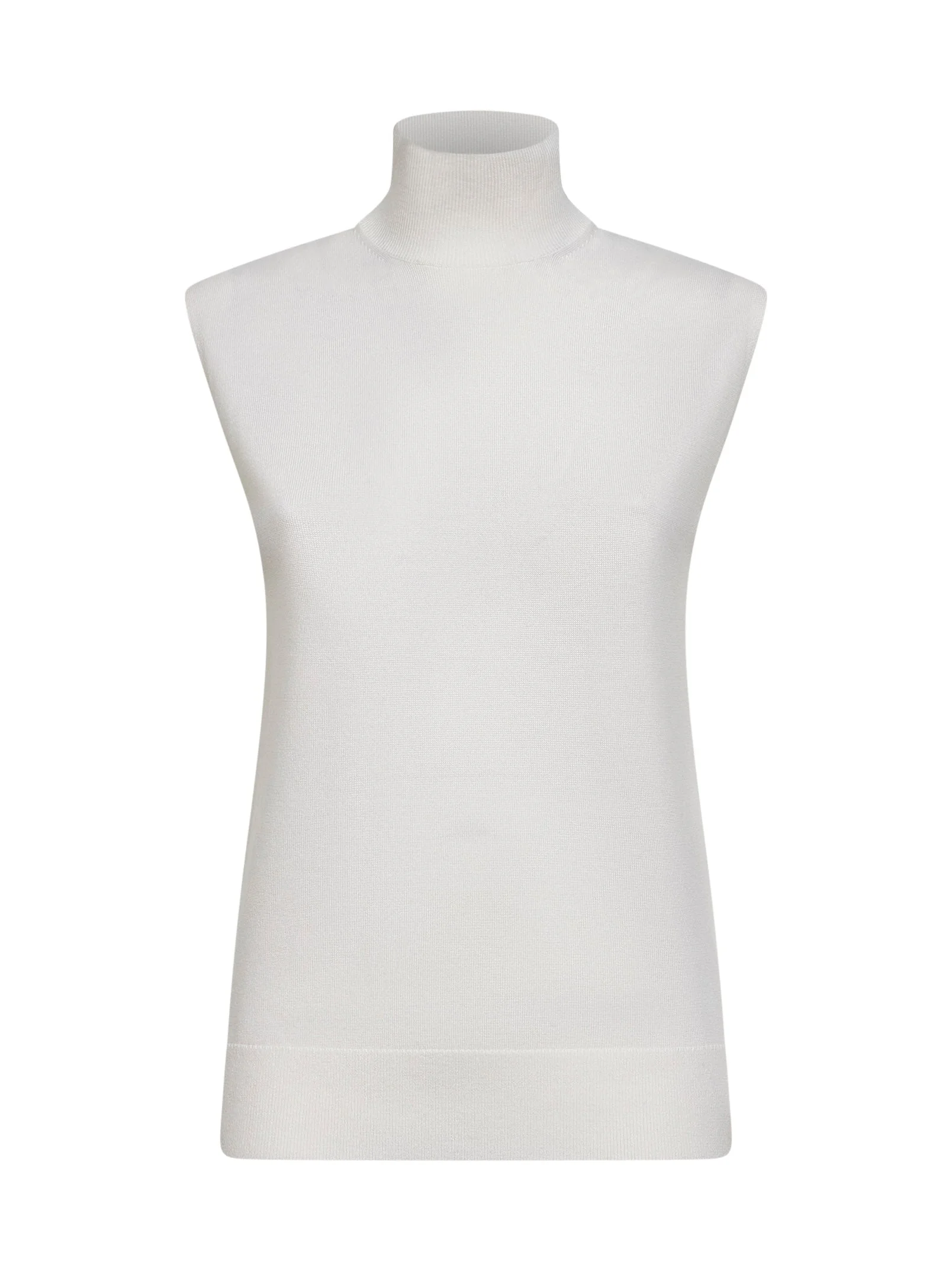 - Ribbed turtleneck collar - Sleeveless - Side slits at bottom - Ribbed bottom band - Fine wool and silk knit design - Regular fit - Ecru color - 70% wool, 30% silk - Made in extra eu Wool or fine animal hair: Wool70 % Natural (Other): Silk30 % Made in: Repubblica Popolare Cinese Season: P26 254WRT0477YA0190-116