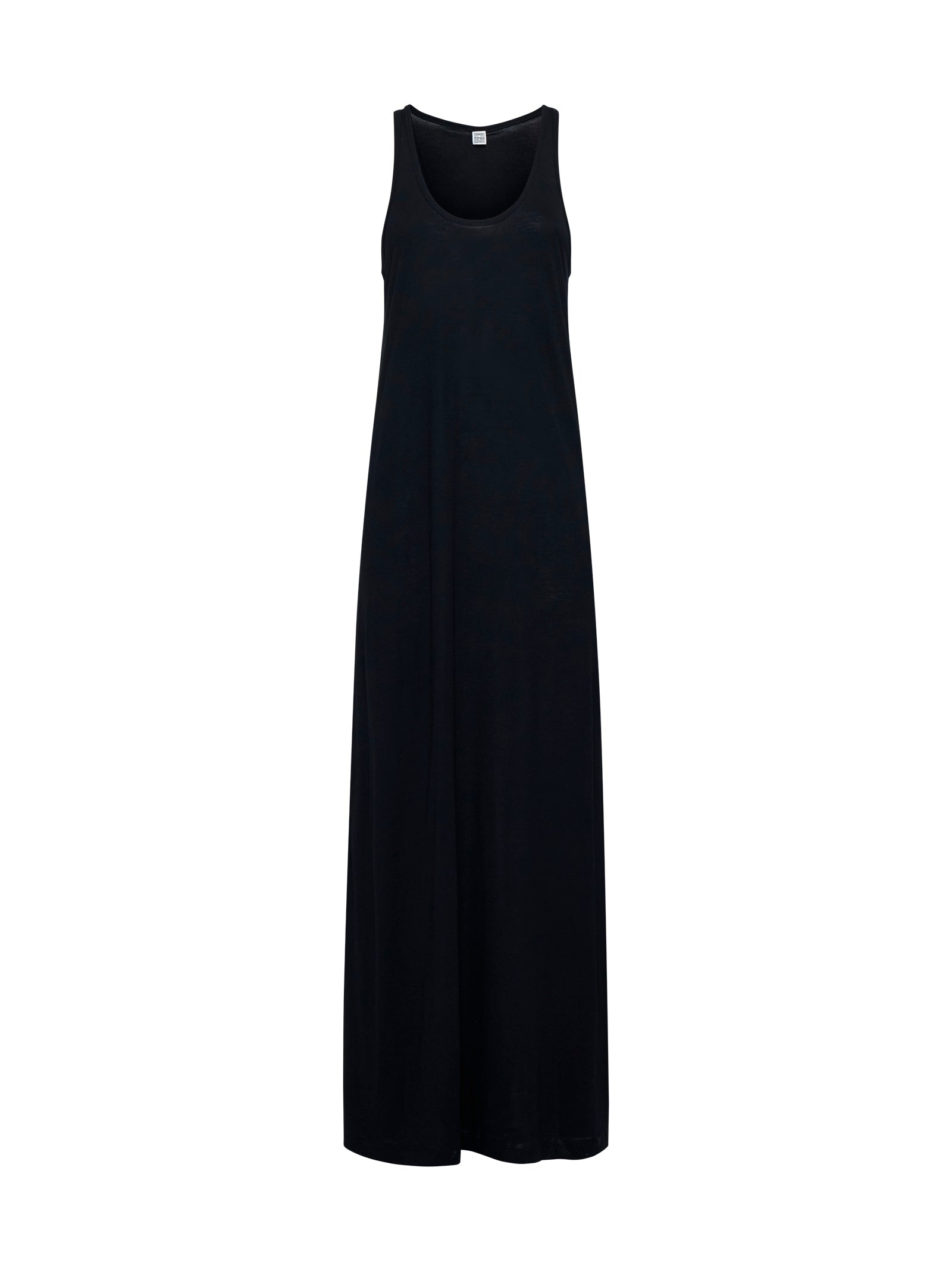 Toteme's long sleeveless dress in black viscose jersey featuring a scoop neck and fitted silhouette slightly flared at the hem. Color: black Size and fit: Model is 176 cm tall and wearing a size S Composition: 100% viscose Country of manifacture: Portugal ID designer: 243WRD4175FB0241-001