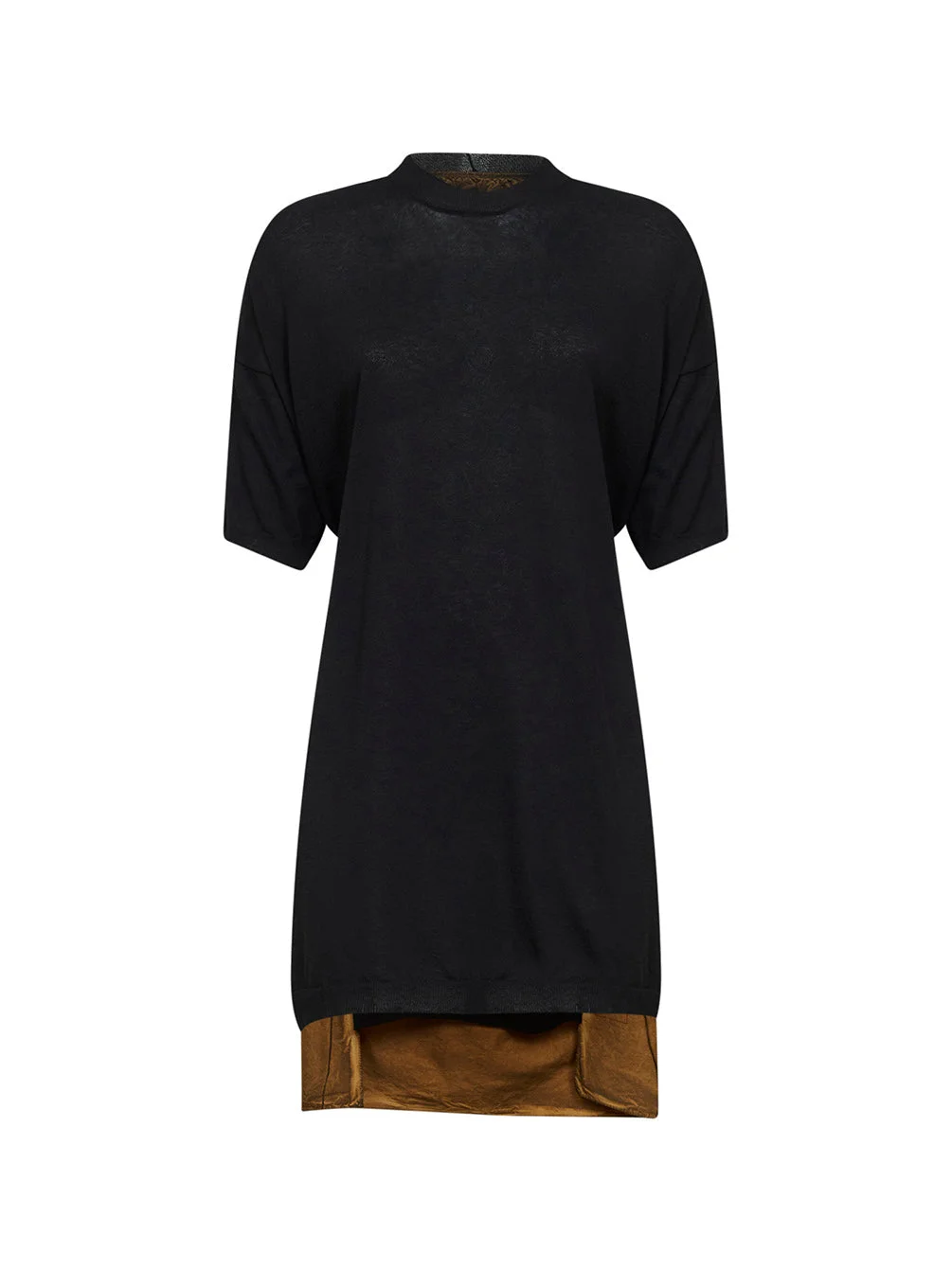 - Ribbed crewneck - Short sleeves, dropped shoulders - Back yoke with gathered detailing - Mustard-colored washed fabric back panel with self-tiest at waist - Ribbed cuffs and front bottom band; raw-cut edges - Asymmetric hemline, dropped back hem - Color: black/mustard - 70% cotton, 30% silk - Made in italy Natural (Veg): Cotton70 % Natural (Other): Silk30 % Made in: Italy Season: P26 UK7137-UW924