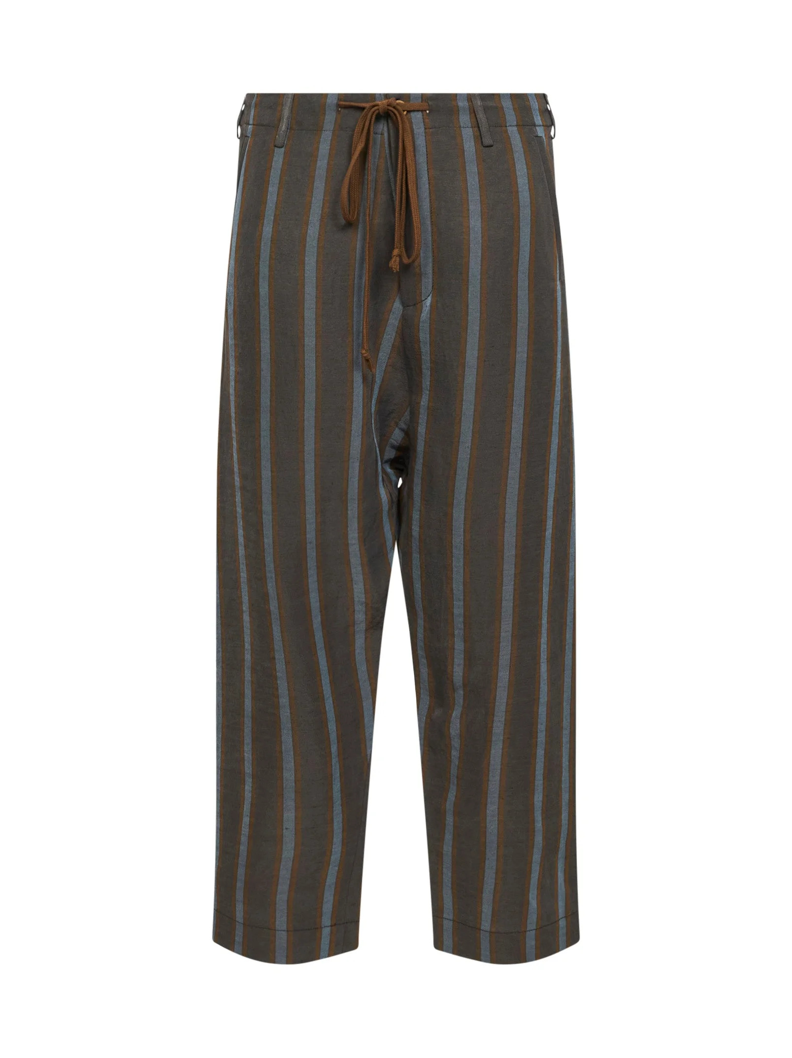 - Front zip-fly and button closure - Adjustable drawstring at waist; waist with belt loops - Dropped crotch - Side pockets, back buttoned welt pockets - Straight leg - Multicolor vertical striped pattern - Relaxed fit - Color: brown/blue - 58% linen, 42% viscose - Made in italy Natural (Veg): Linen/Flax58 % Synthetic: viscose42 % Made in: Italy Season: P26 UM3519-UW063