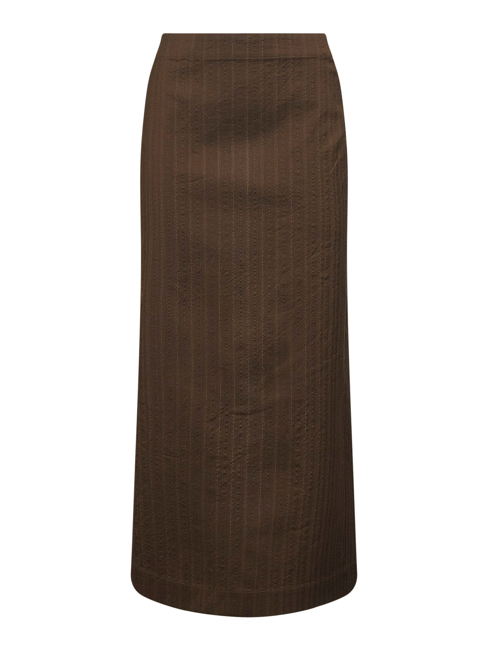 - Back button placket - Regular waist - Central slit at bottom back - Contrasting pinstripe pattern - Midi length - Regular fit - Brown color - 70% virgin wool, 28% viscose, 2% elastane - Made in italy Wool or fine animal hair: Virgin Wool70 % Synthetic: viscose28 % Synthetic: Elastane2 % Made in: ITALIA Season: A25 UW2026-UW600