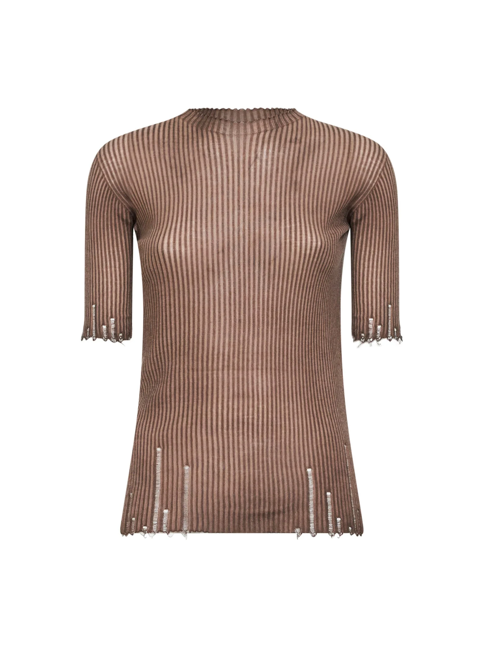 - Crewneck - Short sleeves - Stitching detail at back - Ladder-effect detailing at bottom and sleeves bottom - Straight hem - Scalloped edges - Ribbed knit - Slim fit - Brown color - 100% wool - Made in italy Wool or fine animal hair: Wool100 % Made in: Italy Season: P26 UK7113-UW600