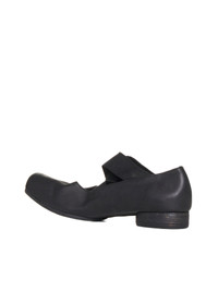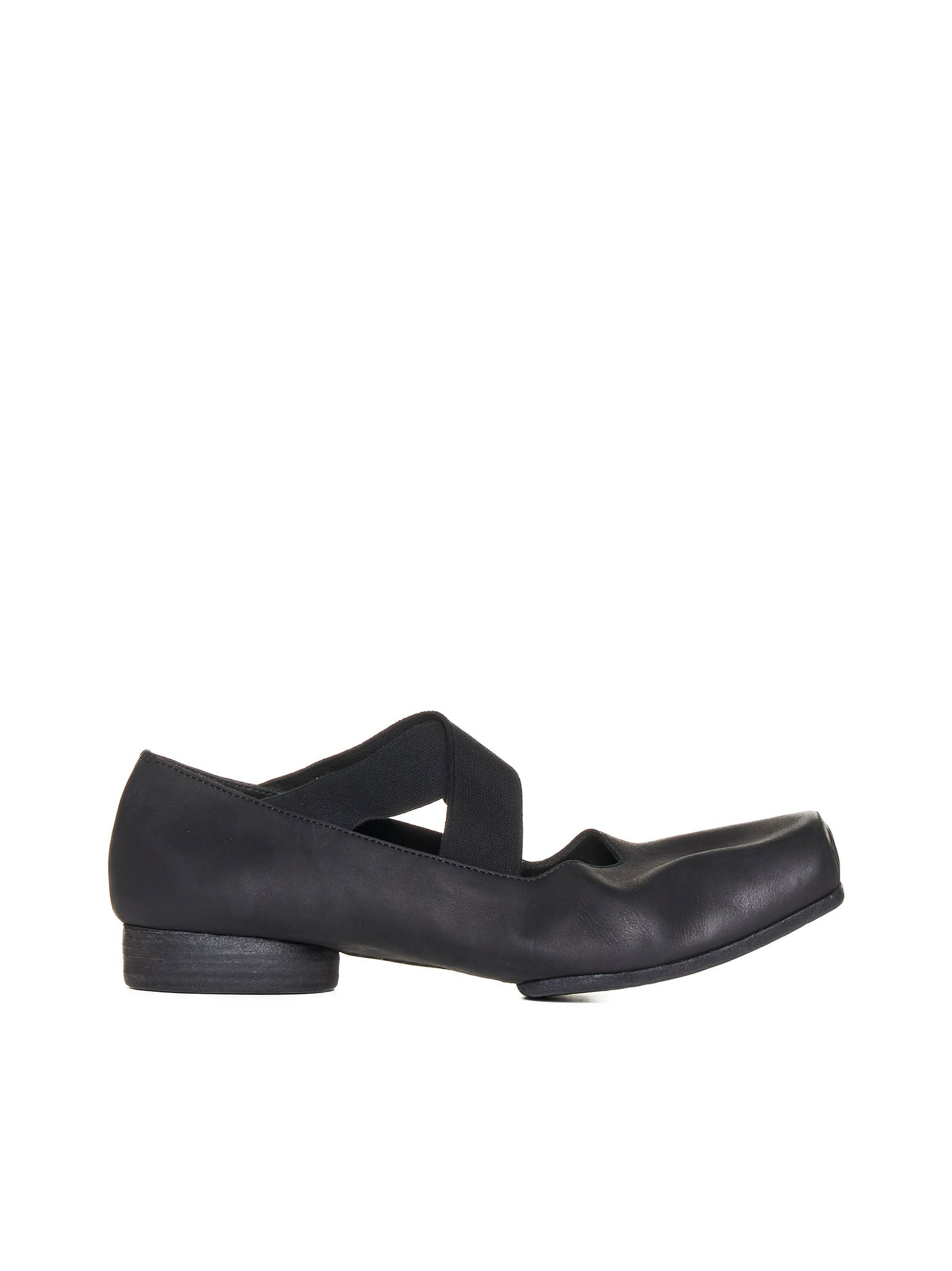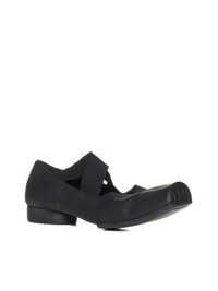 Uma Wang’s black leather ballet flats featuring raised squared toe, elasticated and crossed front straps, leather lining and insole and leather sole with low stacked heel. Color: black Composition: 100% calfskin Country of manifacture: Italy ID designer: US9001-UW900