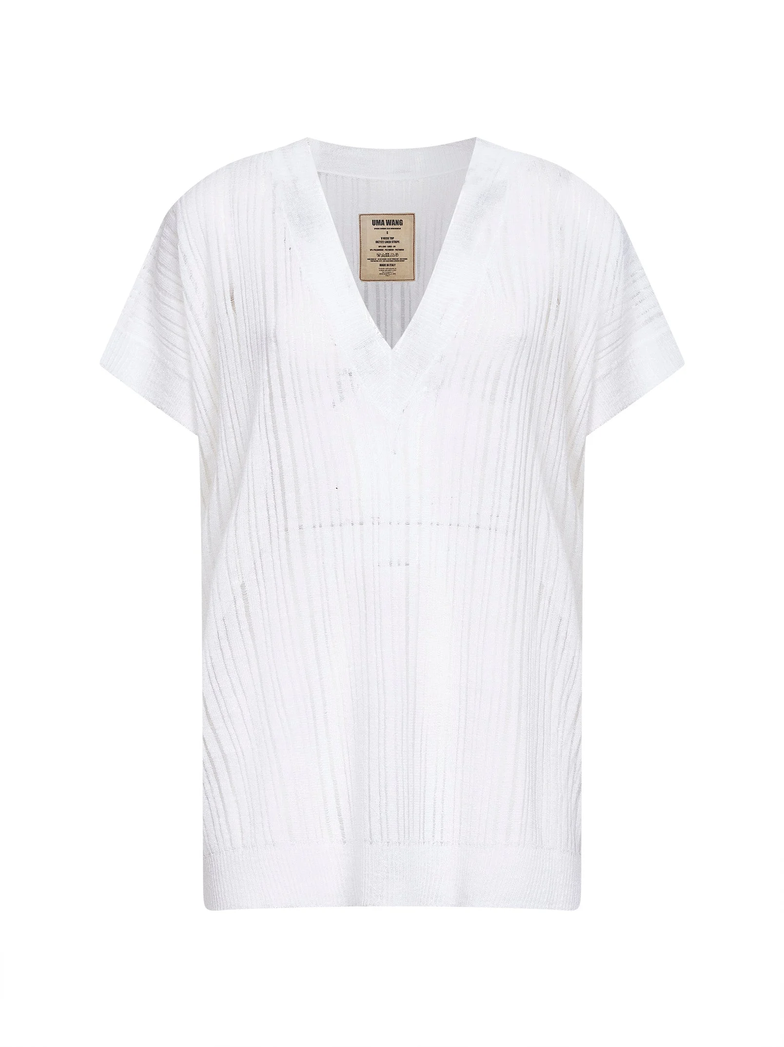 - Ribbed v-neck - Short kimono sleeves - Ribbed cuffs and bottom band - All-over laddered-effect asymmetric vertical striped pattern - White color - 90% linen, 10% polyamide - Made in italy Natural (Veg): Linen/Flax90 % Synthetic: Polyamide10 % Made in: Season: P26 UK7122-UW100