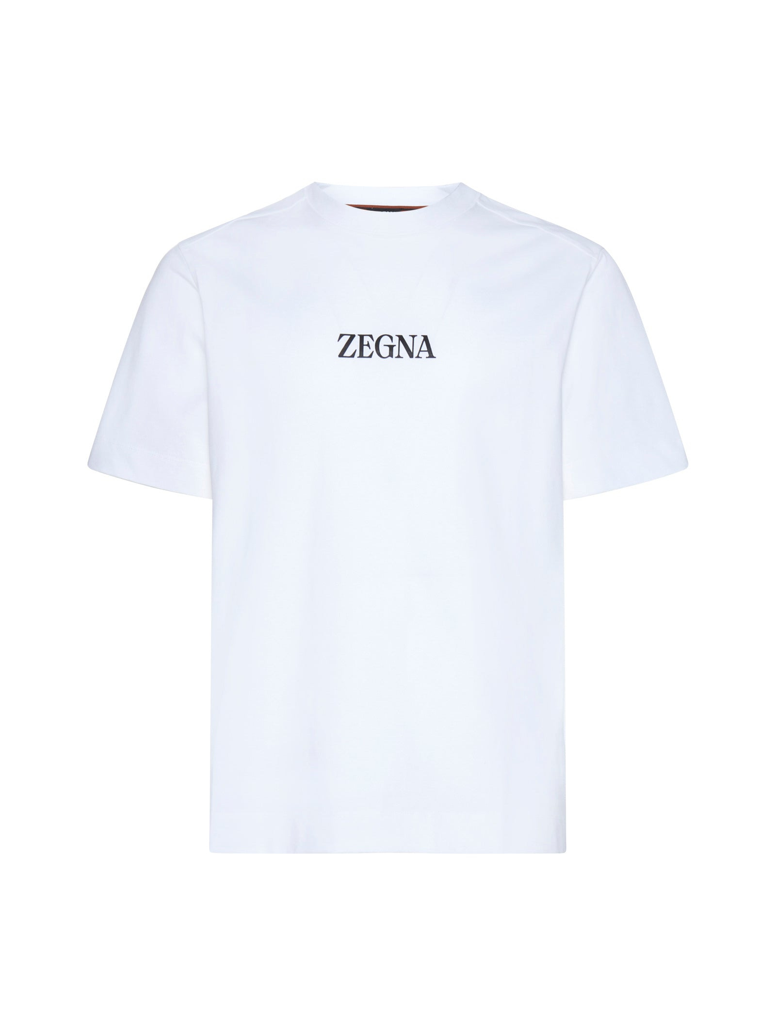 Zegna’s white cotton t-shirt featuring a crew neck and black logo print at chest. Color: White Size and fit: Model is 184 cm tall and wearing a size IT 48 Composition: 100% cotton Country of manifacture: Italy ID designer: E7364A777N01