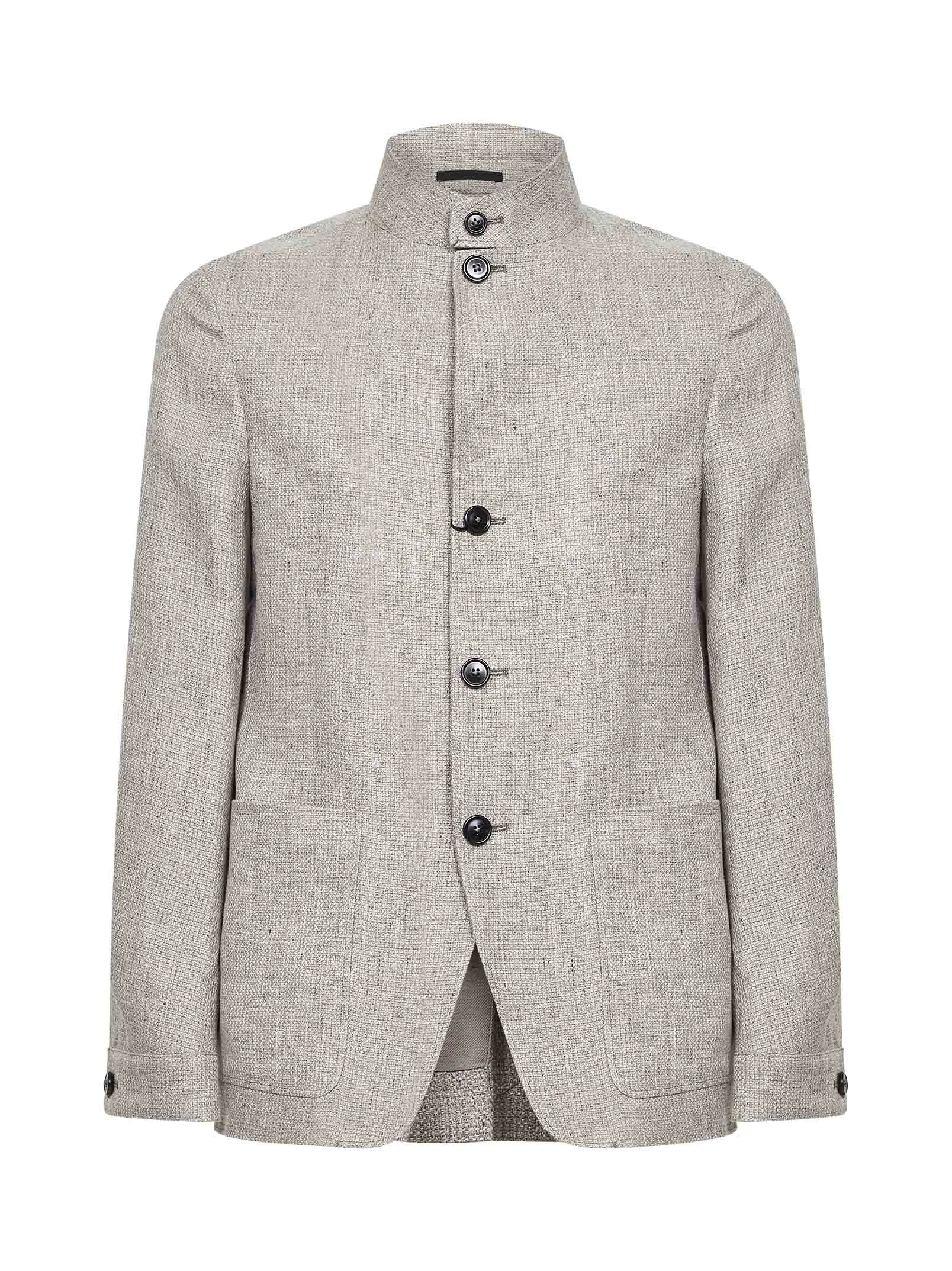 - Single-breasted four-button placket - Stand buttoned collar - Long sleeves, buttoned cuffs - Leather zegna 232 road brand mark at back - Front patch pockets, additional leather pocket in the right pocket - Central slit at back - Deconstructed, fused model - All-over micro-check pattern - Length: 73 cm (size it 48) - Medium brown color - 100% linen - Made in extra eu Natural (Veg): Linen/Flax100 % Made in: Turchia Season: P26 373C79A31VHKQ07