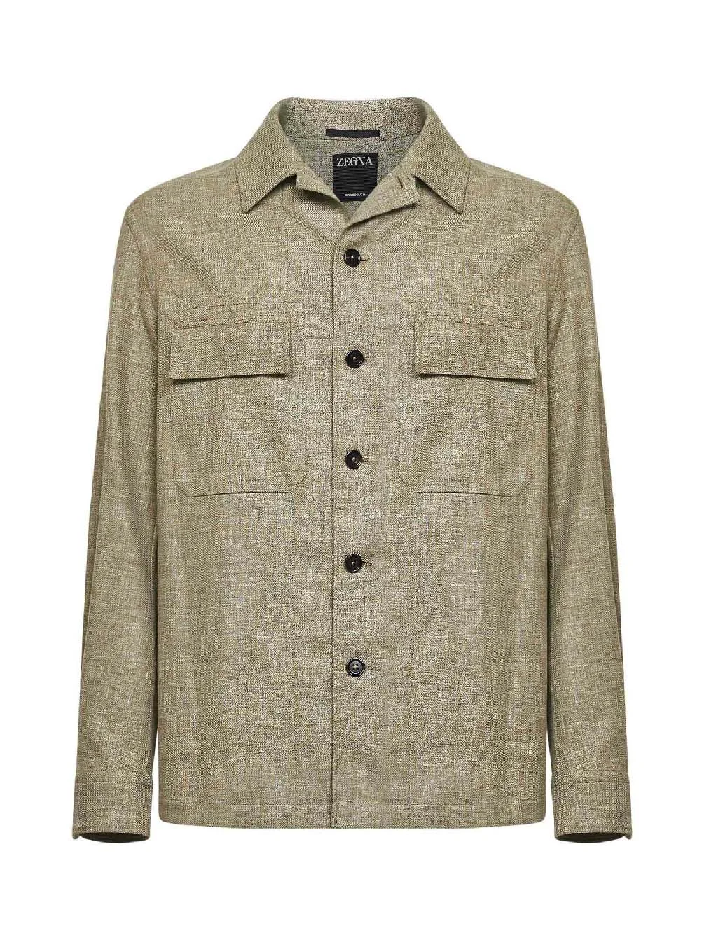- Front button placket - Shirt collar - Long sleeves, elbow patches, buttoned cuffs - Leather zegna 232 road brand mark at nape - Patch pockets at chest with flap - Side slits at bottom - Straight hem - Length: 73 cm (size 39) - Regular fit - Olive green color - 50% linen, 31% wool, 19% silk - Made in switzerland Natural (Veg): Linen/Flax50 % Wool or fine animal hair: Wool31 % Natural (Other): Silk19 % Made in: Svizzera Season: P26 UHV22A3SOT6BV04