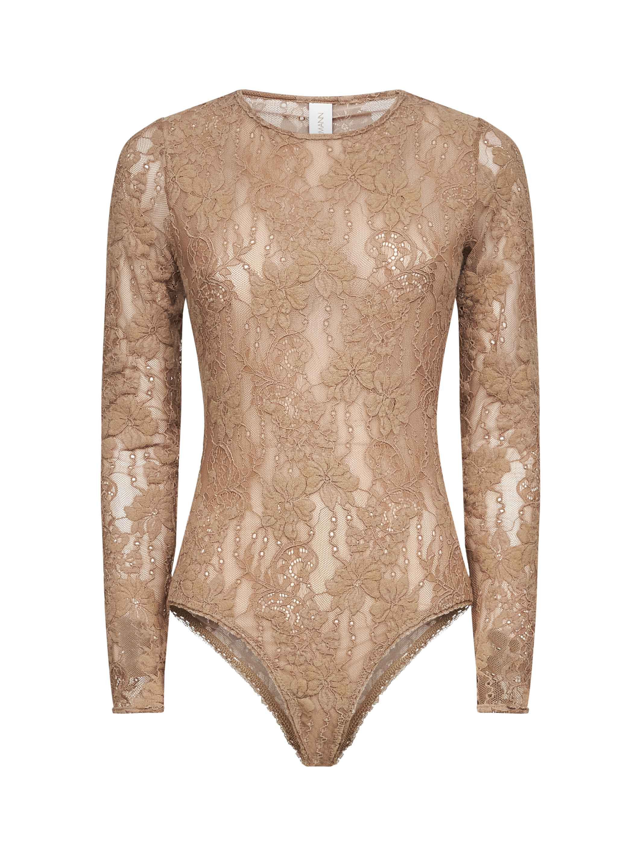 - Gusset snap closure - Crewneck - Long sleeves - Mesh lining; inner jelly tape insert - Stretch lace design - Regular fit - Brown color - 89% polyamide, 11% elastane - Made in extra eu Synthetic: Polyamide89 % Synthetic: Elastane11 % Made in: Repubblica Popolare Cinese Season: A25 8622TF25R-BIS