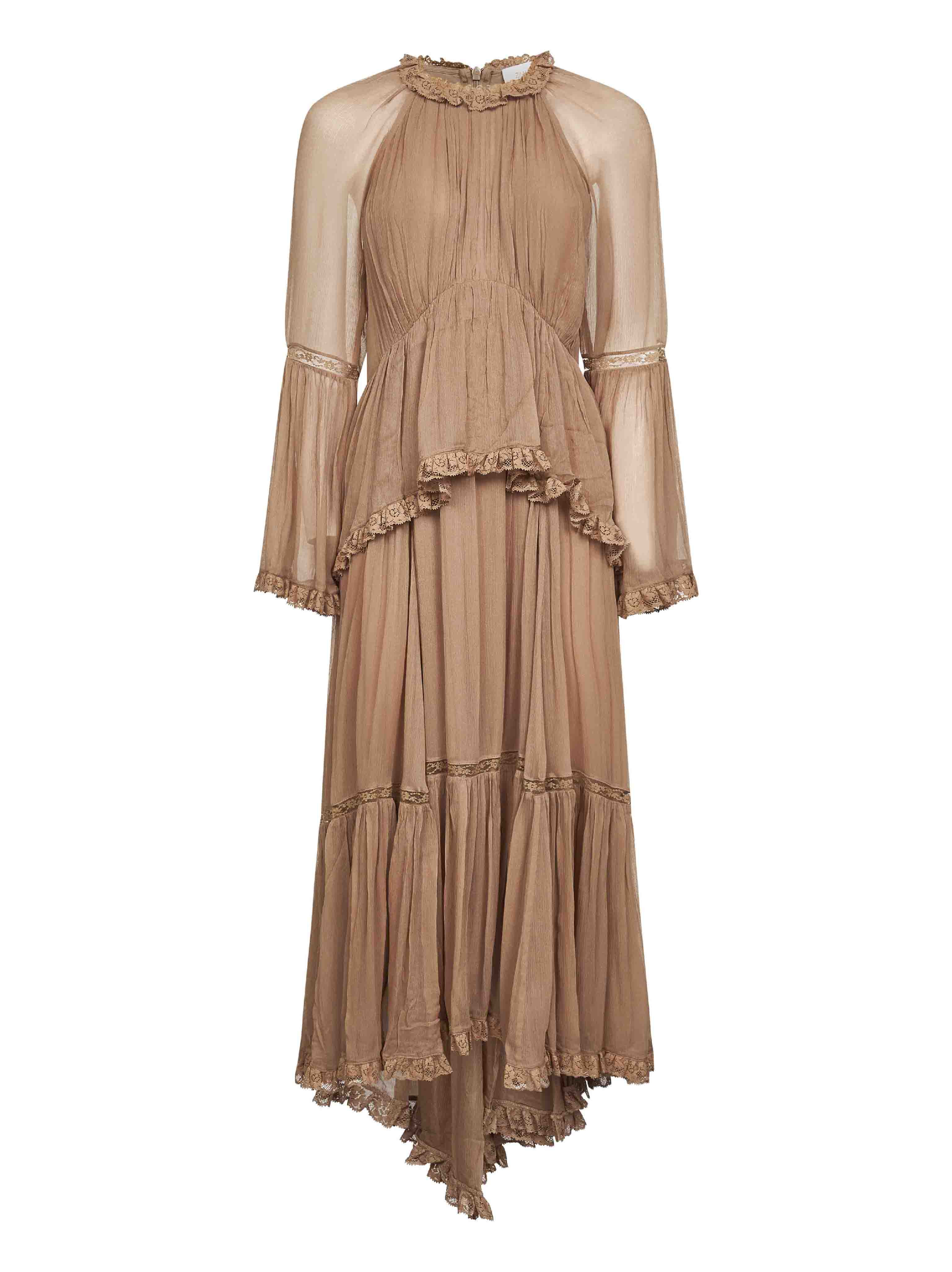 - Back invisible zip closure - Crewneck with lace frill detail - Long and slightly flared sleeves - Peplum at waist with back slit - Tiered skirt - Heavy gathering throughout - Lace trim at sleeves and skirt - Lace ruffles at sleeves bottom and peplum and skirt hem - Asymmetric hemline, dropped back hem - Regular fit - Brown color - 100% viscose - Made in extra eu Synthetic: viscose100 % Made in: Repubblica Popolare Cinese Season: A25 5345DF251-BIS