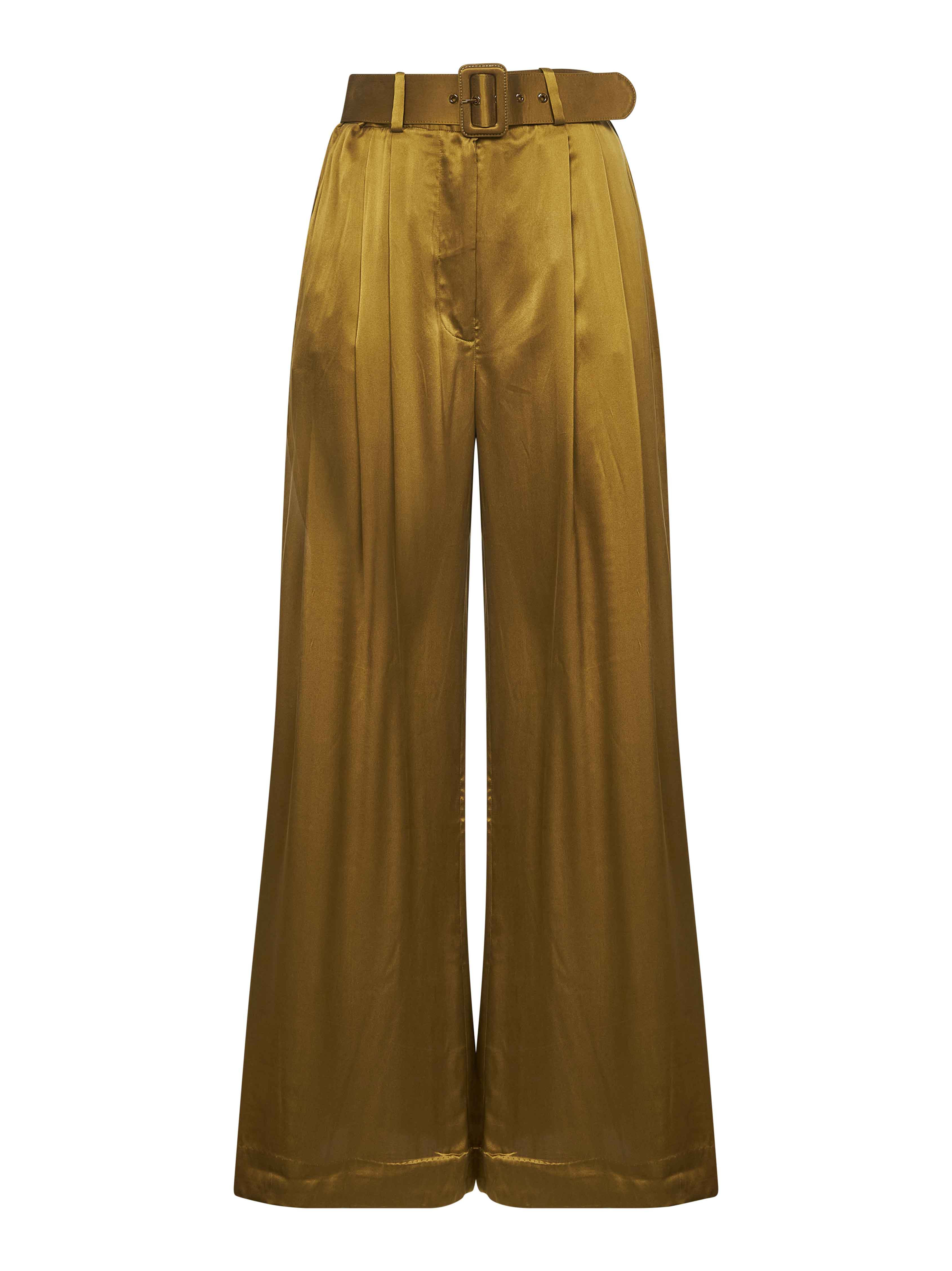 - Covered front closure - High-rise waist with belt loops; adjustable and detachable matching belt at the waist - Side pockets - Double front pleat - Slightly flared bottom - Wide leg - Olive color - 100% silk - Made in extra eu Natural (Other): Silk100 % Made in: Repubblica Popolare Cinese Season: A25 2151PF25R-OLV