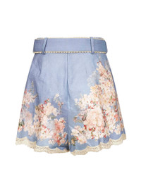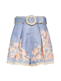 Cascadian belted lace-trimmed pleated floral-print linen shorts Blue