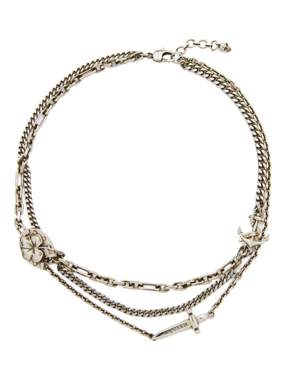 Multi-strand chain necklace with silver pendants. Closure with snap hook and logo skull. product code: 836735J161N1500 COMPOSITION Made in Italy 100% brass