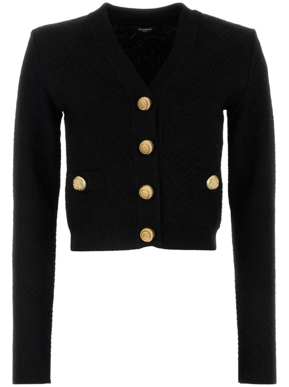 Stretch viscose blend knit cardigan with padded shoulder straps and gold metal "Chiocciola" buttons. product code: DF0KL007KH580PA COMPOSITION 73% viscose, 15% polyamide, 10% polyester, 2% elastane MADE IN FRANCE