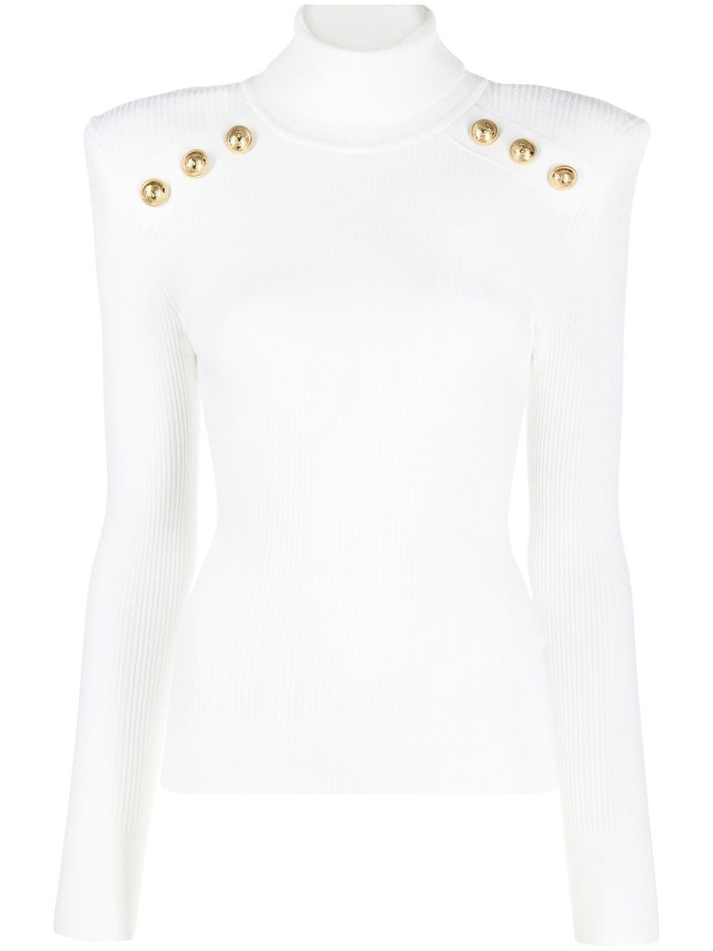 Ribbed knit top. Turtleneck. Structured shoulders. Gold color skirted buttons. product code: YF0KH000KB000FA COMPOSITION 83% viscose, 17% polyester MADE IN ITALY