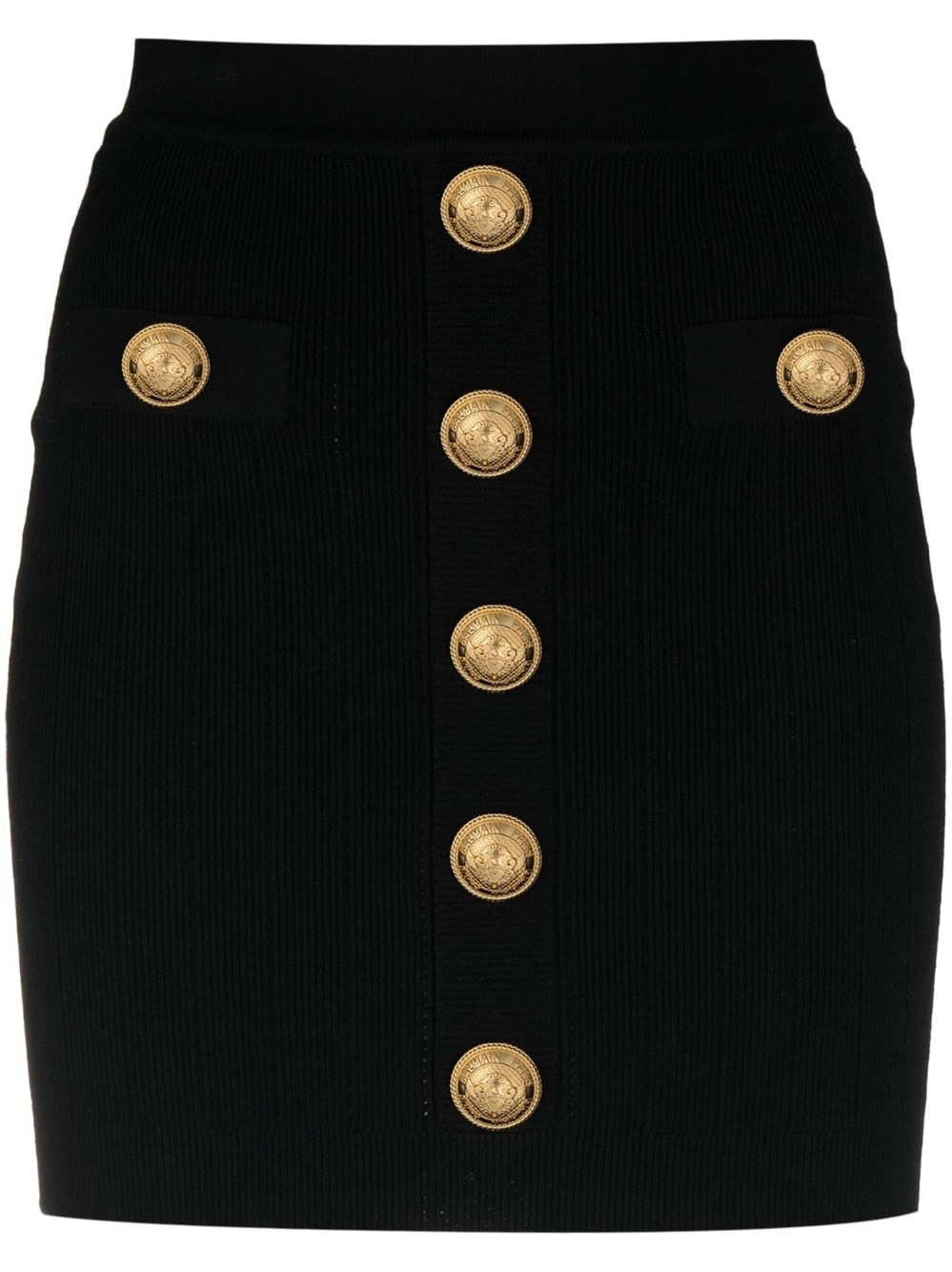 Punto Milano knit high waist skirt. Details featuring embossed gold buttons. Gold back zip closure. product code: AF0LB290KB07OPA COMPOSITION 83% viscose, polyester 17% MADE IN ITALY MADE IN FRANCE