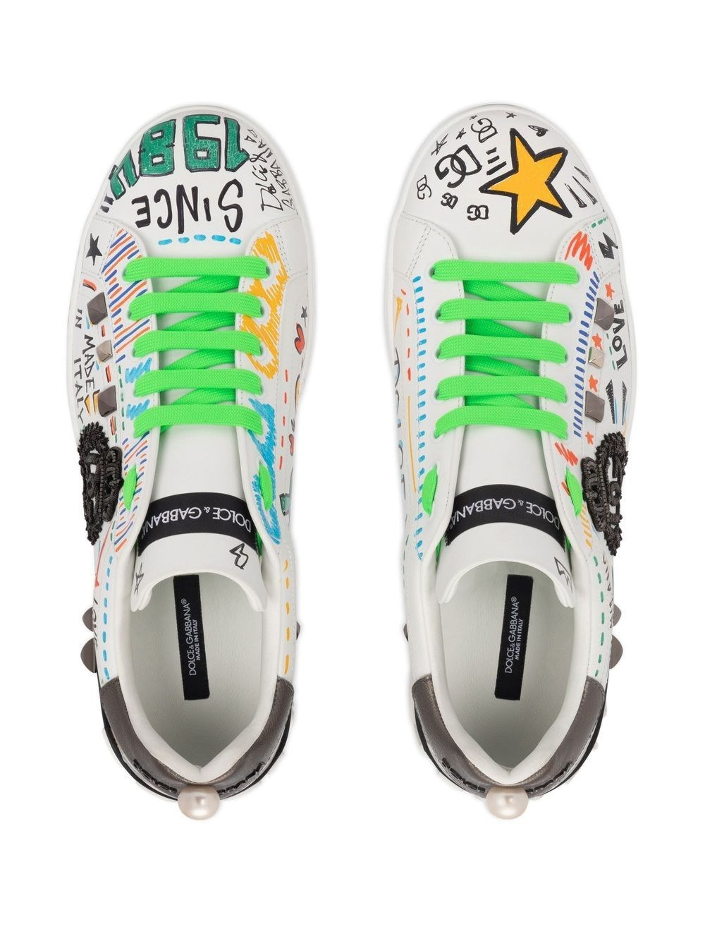 White leather lace-up sneakers, multicolor prints and ll-over beads applications. Rubber sole with logo detail on the heels. product code: CS1772AH502HWF57 COMPOSITION Made in Italy 100% lamb leather