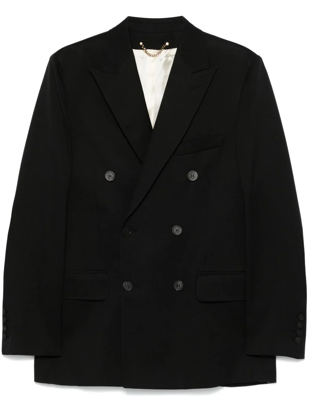 Black double-headed blazer with pointed lapels and welt pockets. product code: GMP00835P00152190100 COMPOSITION Made in Italy 100% virgin wool