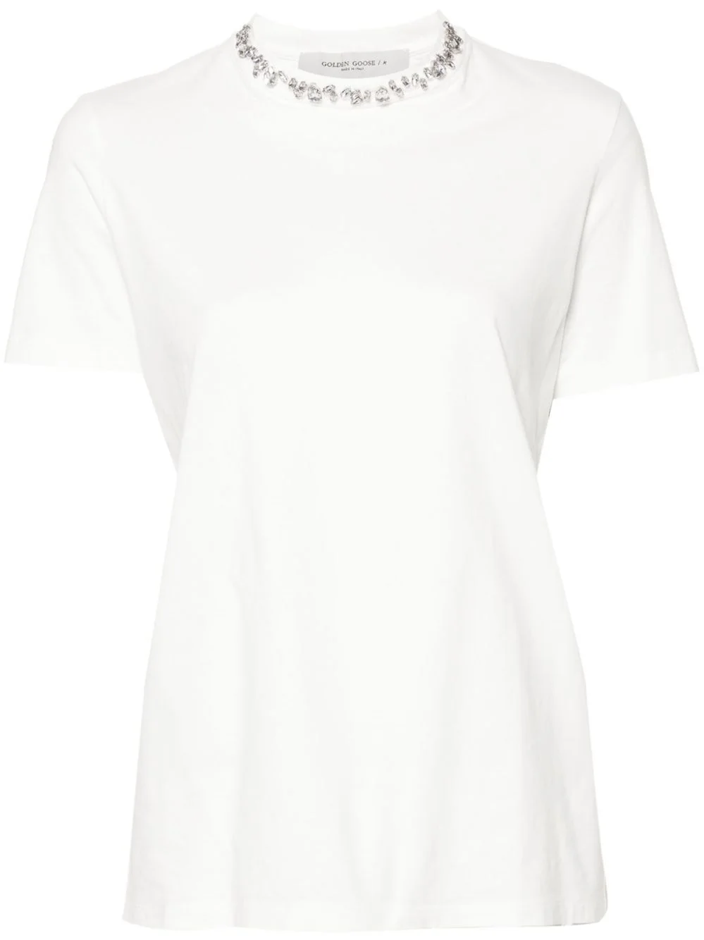 White cotton t-shirt with cabochon crystals applied on the neck. Regular fit. product code: GWP01220P00067310363 COMPOSITION 100% cotton MADE IN ITALY