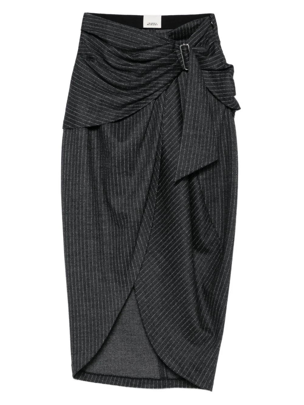 Tube midi skirt in virgin wool and cotton blend. Pinstripe pattern. Draped waist with buckle detail. Tight cut with asymmetrical lower hem. Back closure with concealed zipper. product code: JU0417FAC4J12I02AN COMPOSITION 86% virgin wool, 14% cotton MADE IN POLAND