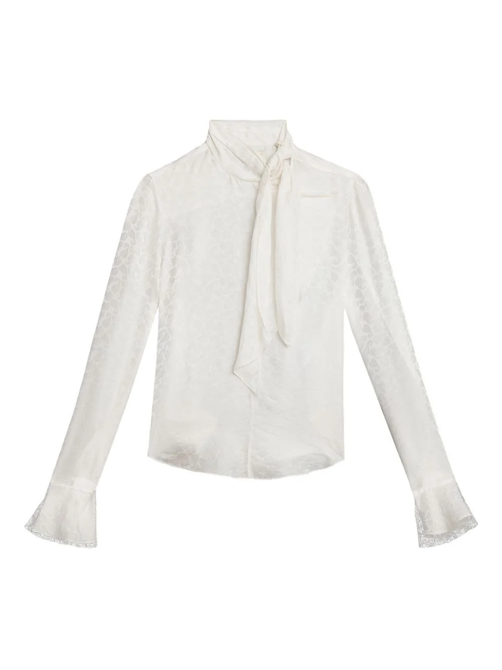 Jacquard silk blend blouse with all-over cashmere pattern. High neck with lavalliere bow. Long sleeves with buttoned cuffs decorated with lace. Asymmetric button closure. product code: HT0744FAC4J07I20WH COMPOSITION Viscose 70% silk 30% MADE IN INDIA