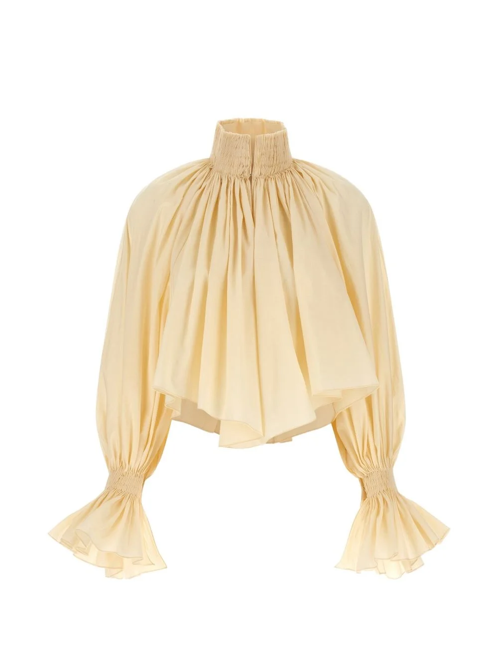 High neck cotton blend blouse. Pleated flared line. Elasticated cuffs. Long puff sleeves. Asymmetrical hem. product code: 24321001108 COMPOSITION 83% cotton, 17% polyester MADE IN ITALY
