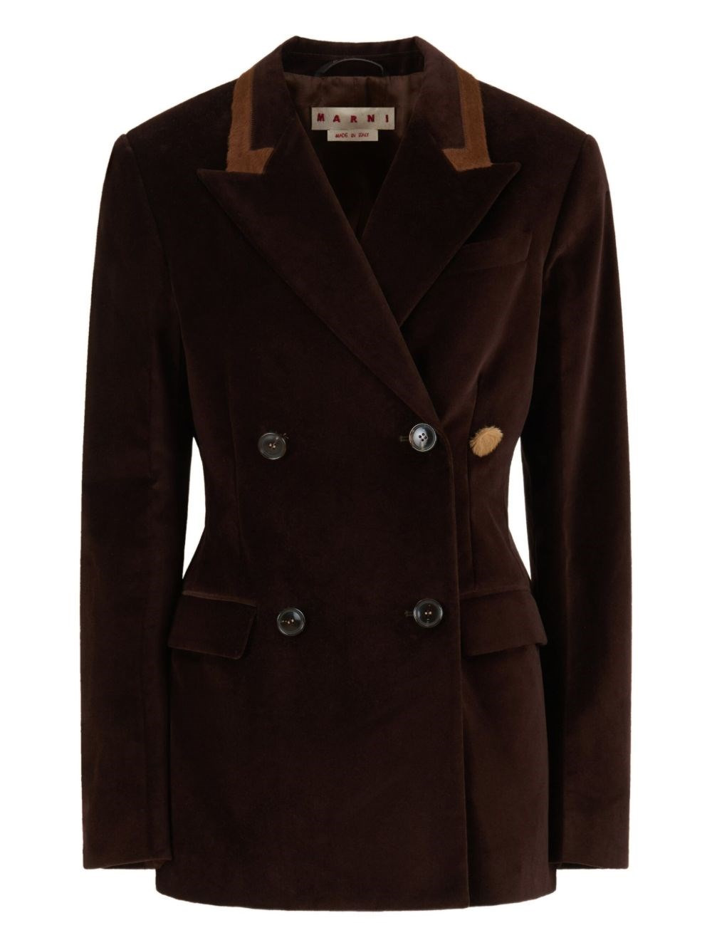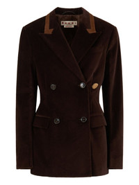 Brown velvet blazer with lapel trim and contrast pony hair button. Chest pocket. Flap pockets. Split at the back. Logo embroidery detail on one sleeve. product code: GIMA0311NSUTC55000M69 COMPOSITION 100% cotton, 100% pony, 100% leather, 100% rayon; Lining: 100% viscose MADE IN ITALY