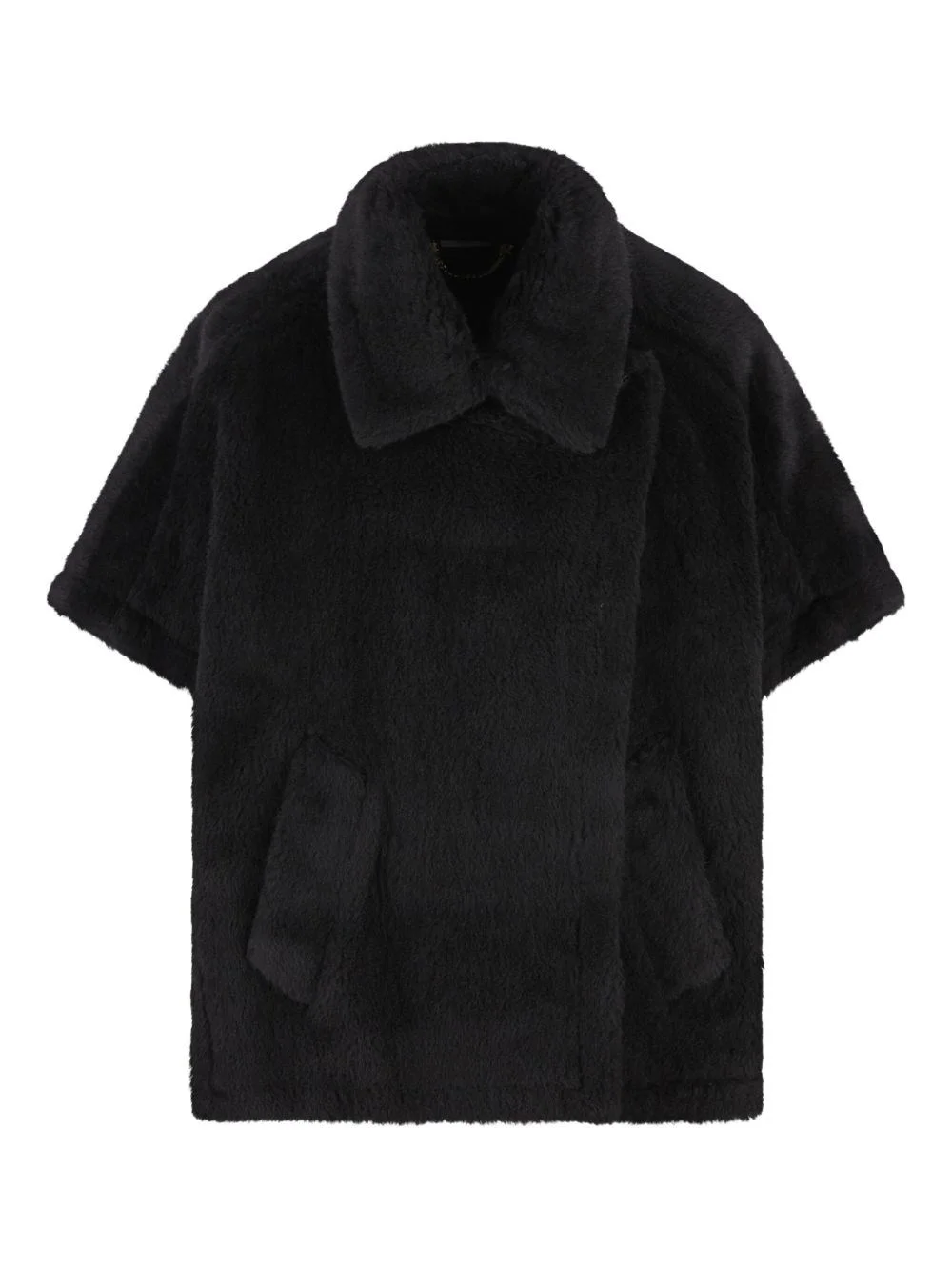Teddy alpaca and wool fabric cape on a silk base. Double use collar to wear open lapels or closed with button. Short kimono sleeves. Asymmetric button closure. Diagonal welt pockets on the sides. Viscose lining. product code: 2524736122600008 TEBE1 COMPOSITION 62% alpaca 26% virgin wool, 12% silk; Lining 100% viscose. MADE IN ITALY