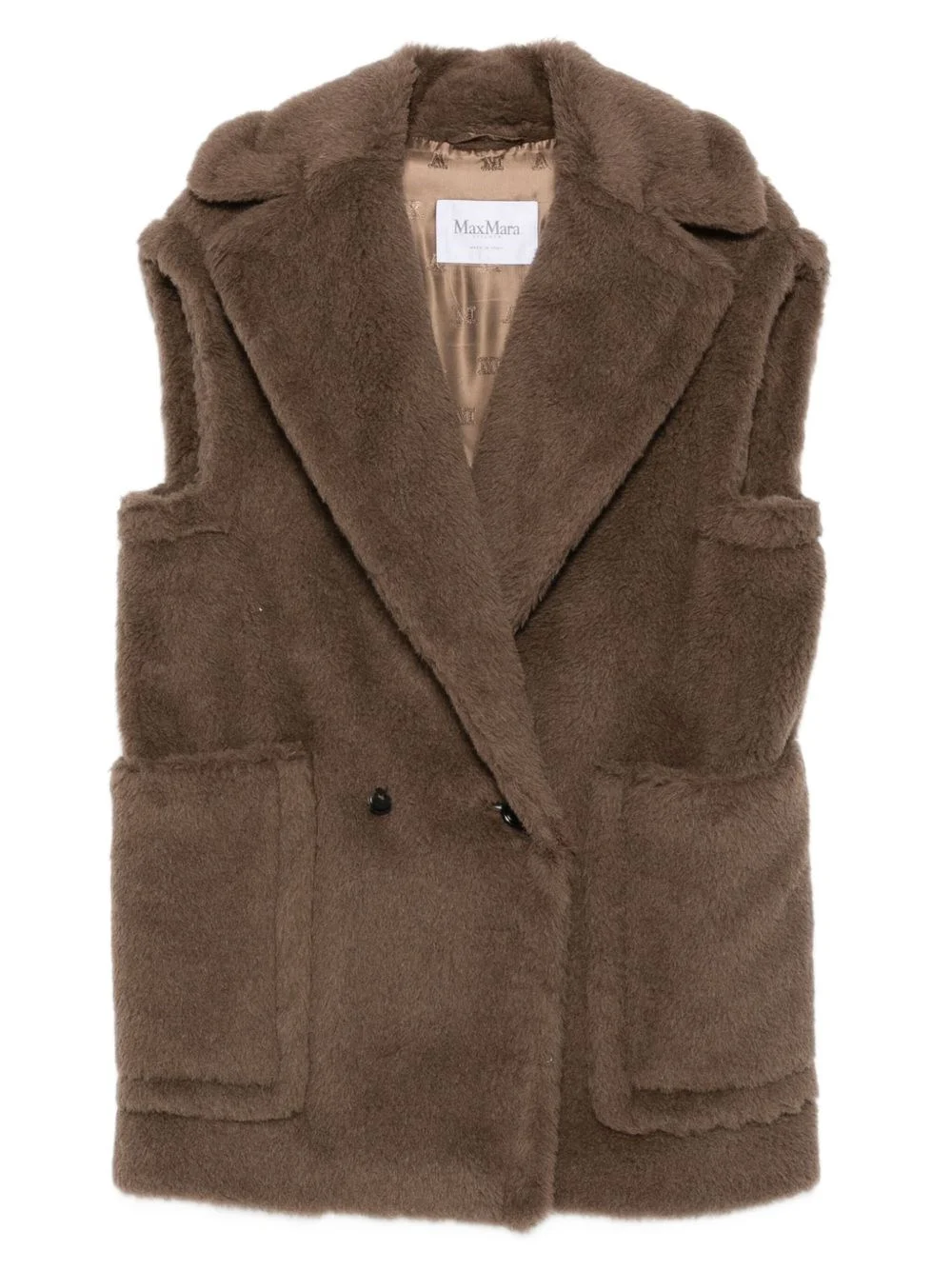 Alpaca and wool-based vest in Teddy fabric on a silk base. Wide line. Maxi lapel collar. Front closure with 2 visible buttons. Large patch pockets on the front. Lined with Monogram jacquard stretch fabric. product code: 2521276253600004 BORMIDA1234 COMPOSITION 62% alpaca 26% virgin wool, 12% silk; Lining 100% viscose. MADE IN ITALY