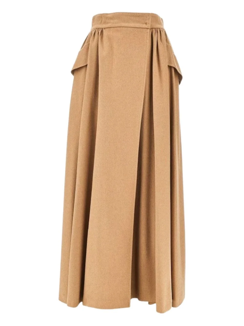 Fake wallet midi skirt with light drap of pure sable camel. Wide line. Flap pockets on the sides. Asymmetrical cut in the center on the front. Invisible zip closure at the back. product code: 2521106213600001 EUFEMIA COMPOSITION 100% camel. MADE IN ITALY
