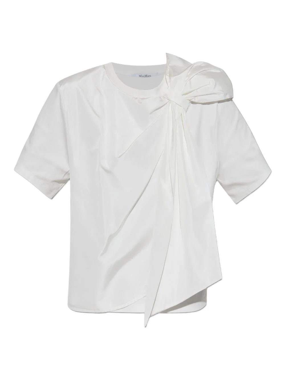 Heavy cotton jersey T-shirt with taffeta panel overlapping on the front and bow knotted at the top. product code: 2521946011600001 COLLE COMPOSITION 100% cotton; 75% polyester, 25% silk. MADE IN ITALY