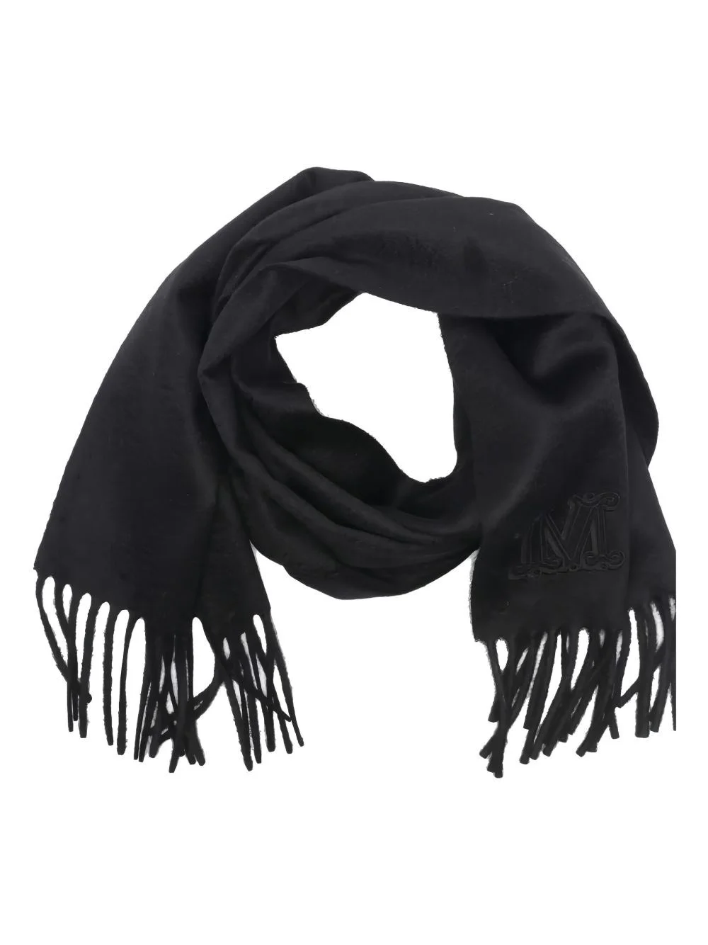 Black stole in pure sable cachemire yarn. Fringed pattern on short sides. M Monogram detail embroidered in tone on the hem. product code: 2524546311600008 WSDALIA COMPOSITION 100% cashmere MADE IN ITALY SIZE & FIT 28 x 206 cm